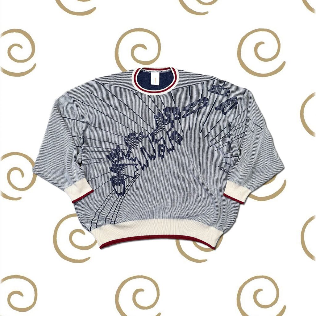 The Bakabon Cotton Knit features a text-based pattern knitted in jacquard.