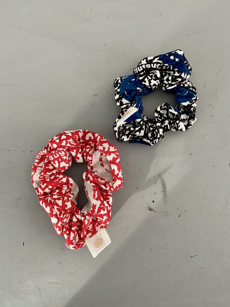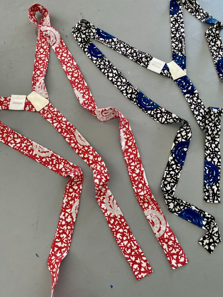 工場さんの奥から、ちりめんロゴの生地が出てきました。これは、シュシュやサスペンダーにピッタリ!と閃いて形にしたアクセサリーです。
