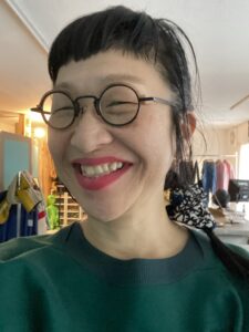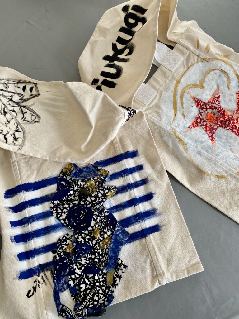 ハンドペイントと、ちりめんロゴ素材をちくちくハンドで縫い付けました。