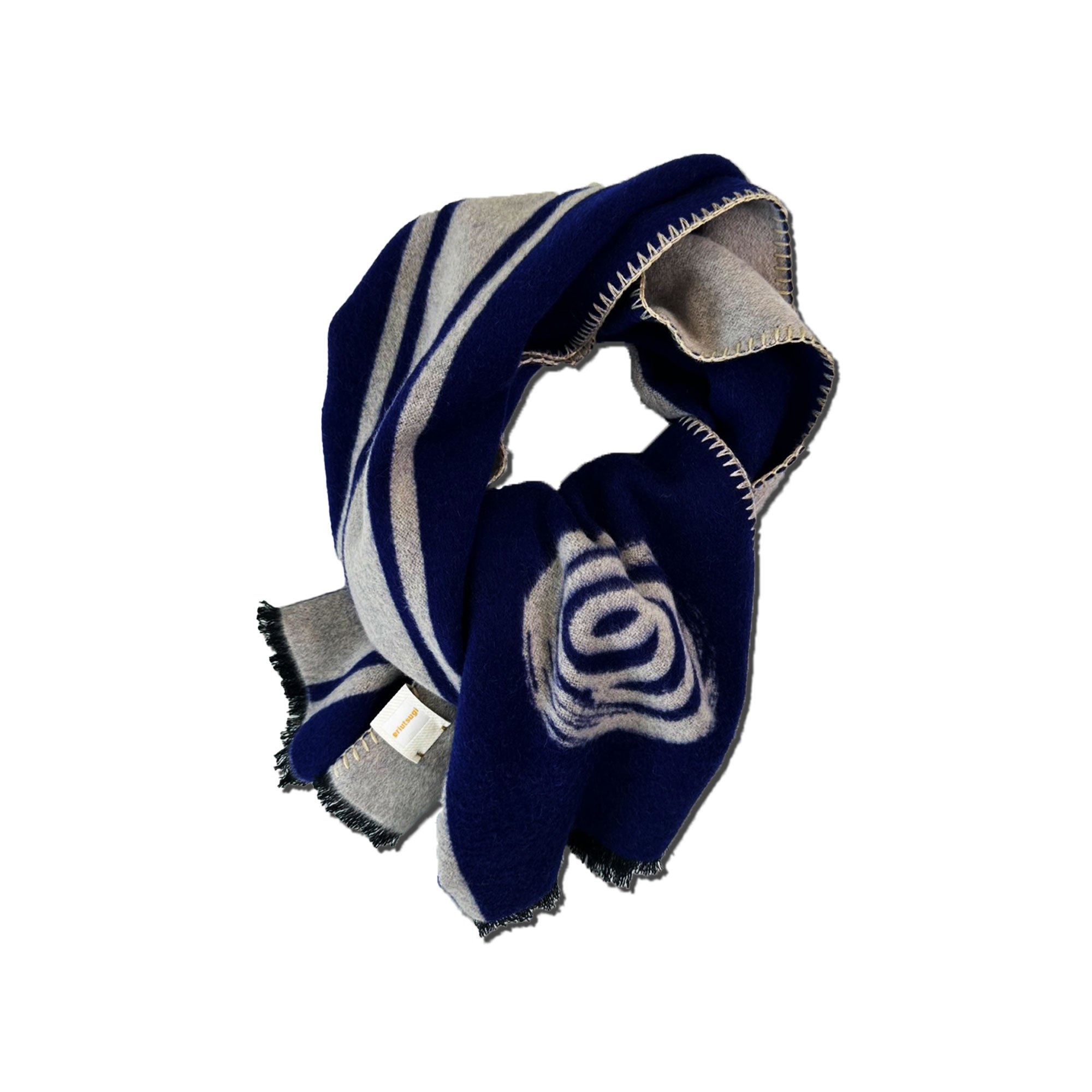 Introducing our luxurious and warm Cashmere Scarf, designed for both comfort and style.The scarf is woven with black cotton yarn as the warp, giving it a firm texture and a subtle color accent that adds an original, unique touch. This piece was created by challenging traditional design techniques, using an unusually large repeat pattern in the weave—something we’ve never done before.The color is also a highlight, as we’ve dyed it in an exclusive, original shade of blue. This vibrant, powerful blue is unlike any other and adds an extraordinary pop of color to any outfit.No matter what coat you pair it with, this scarf serves as an elegant accent, bringing a touch of sophistication and brightness to even the simplest looks. It also pairs wonderfully with bold-colored clothing, making your outfit even more playful and fun.When you wear the off-white side facing out, you get a soft, basic look, which gives you two styling options to enjoy with this scarf.Our current recommended way to wear it is to tie it like a ribbon around your neck. It’s a chic and stylish look that works beautifully for both men and women. You can also casually drape it over your shoulders for a relaxed, fashionable feel.This elegant yet casual scarf is an essential for your winter styling. We hope it helps you stay stylish and warm throughout the cold season. Each scarf is finished with a special touch—our name is hand-stitched with golden thread by Utsuki herself. (Yes, it’s truly sewn with care! 😊)With heartfelt gratitude, we are excited to deliver this special piece to you.♡SizeLength: 164 cmWidth: 60 cmMaterial40% Cashmere40% Wool20% CottonColorBlue