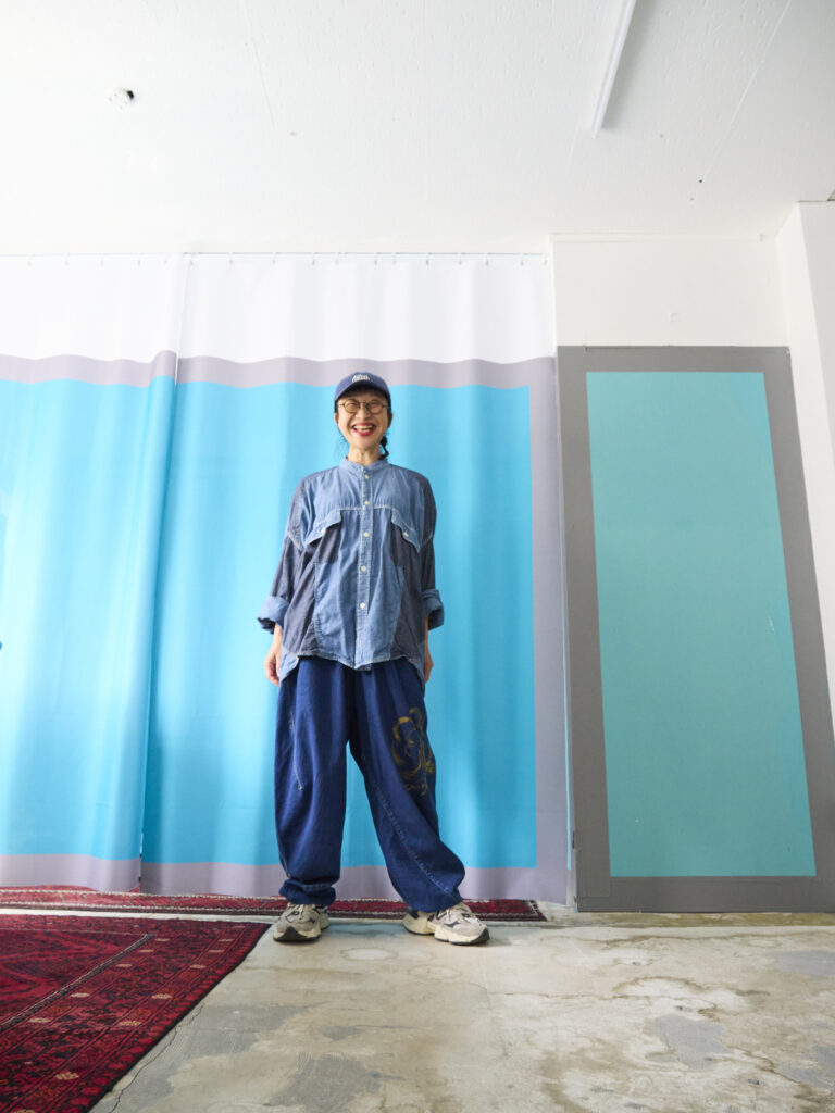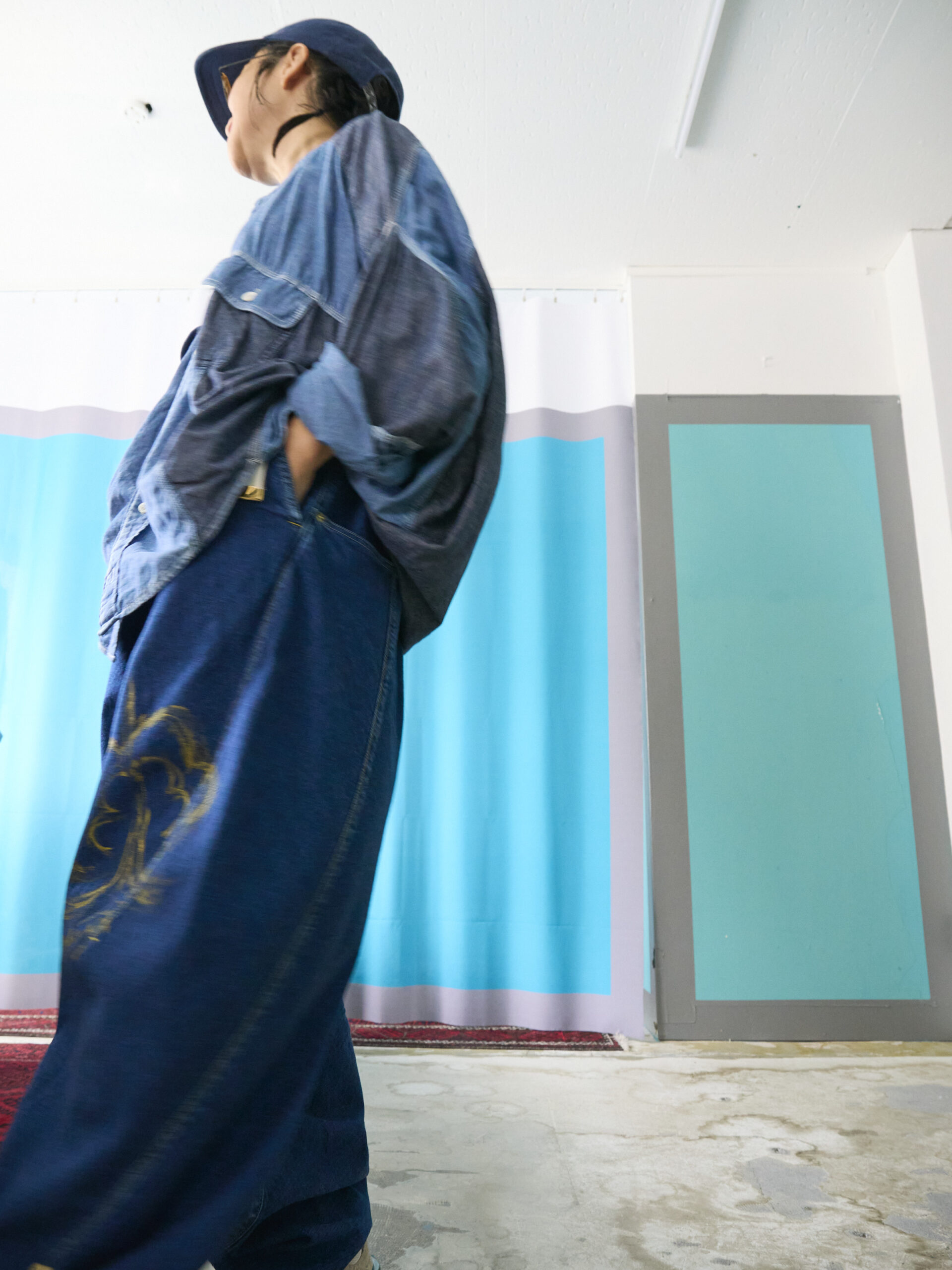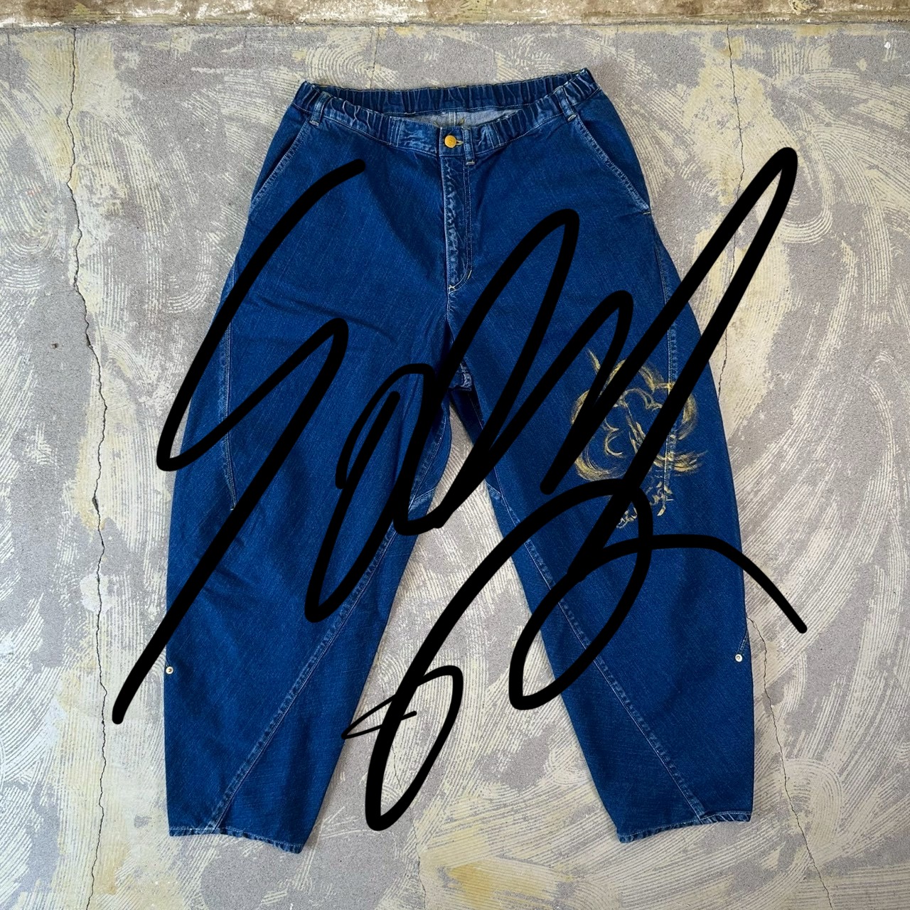 And with that feeling growing inside me, I was inspired to paint a “Tree of Thanks.”[Size]Total length:109cm,Hip: 126cm,Rise: 41cm,Inseam: 74cm,Hem circumference: 39cm,Minimum waist (elastic): 72cm,Maximum waist(elastic): 98cm[Material]100% Organic Cotton[Color]Tree of Thanks Denim size SB