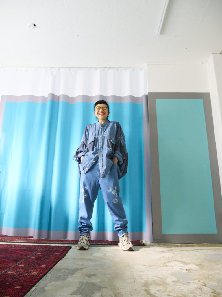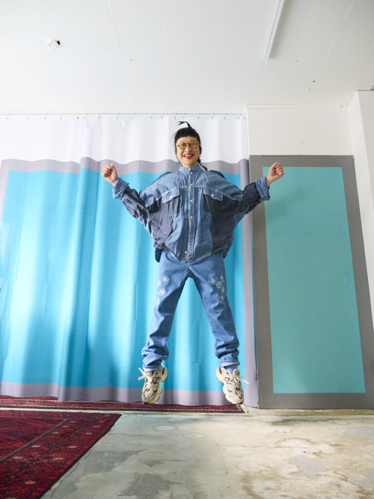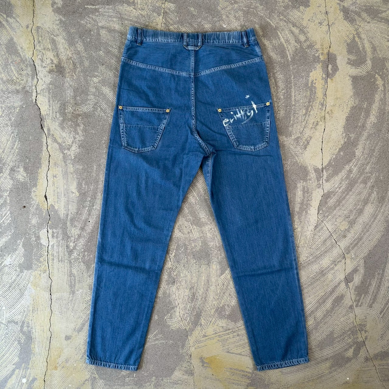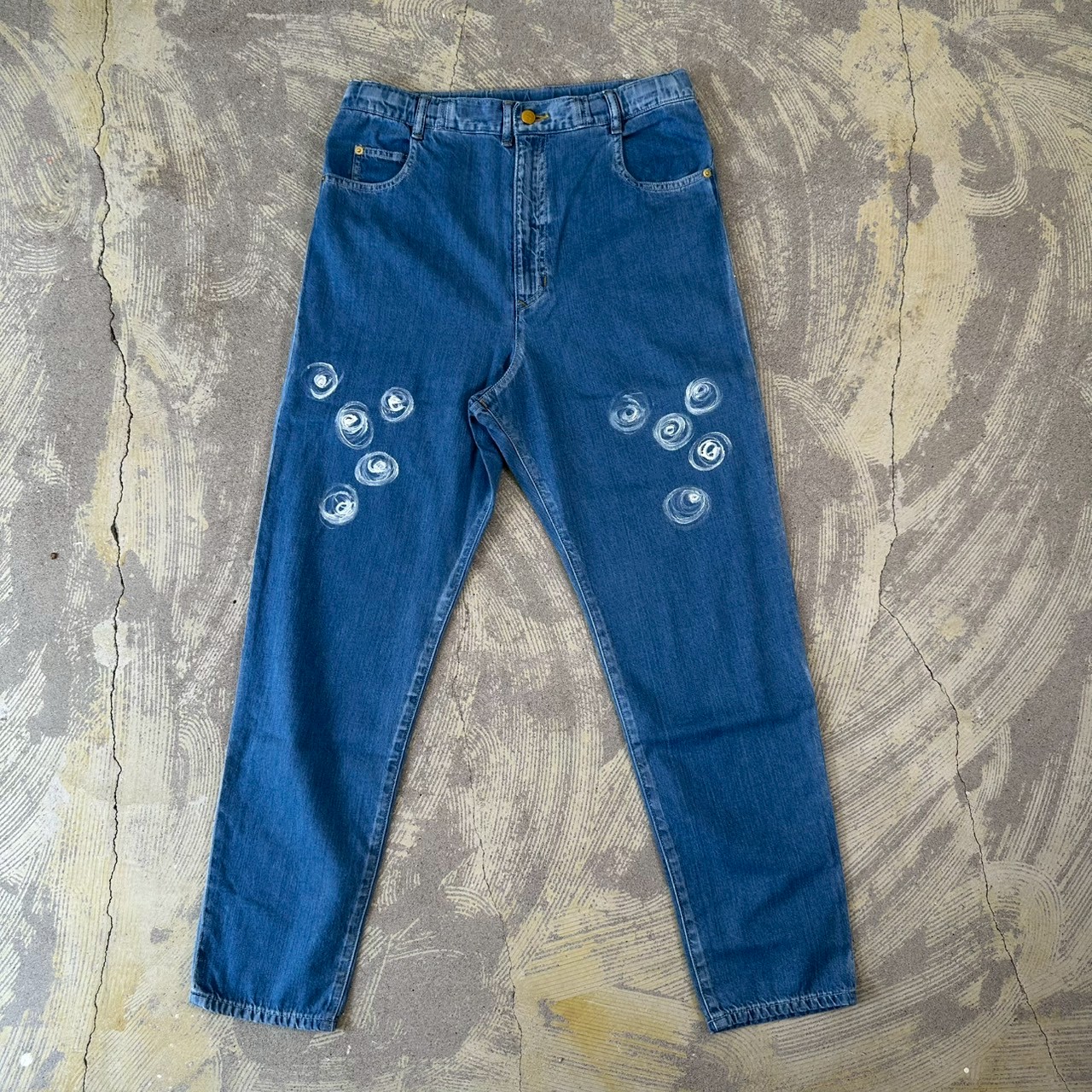 I had been trying to draw the eriutsugi “e swirl” motif in embroidery, but no matter how many times I tried, it just wouldn’t land. Then, on a whim, I changed my pen—and finally, it came together.♡For next spring, I had an image of a certain pattern, but the technique would have made the fabric cost skyrocket, so I had to let it go. Still, it lingers in my mind, leaving me with a sense of unfinished business.At such a moment, watching an animal video soothes that frustration.Sometimes it’s the unpleasant feelings that drive us to take action. Without them, maybe I wouldn’t have moved at all?And so, this day became “Sobakasu.”I find the little whisker spots on dogs and cats so dear.[Size]Total length: 107cm,Hip: 103cm,Rise: 33cm,Inseam: 74cm,Hem circumference: 34cm,Minimum waist (elastic): 65cm,Maximum waist (elastic): 85cm[Material]100% Organic Cotton[Color]SOBAKASU Denim size F