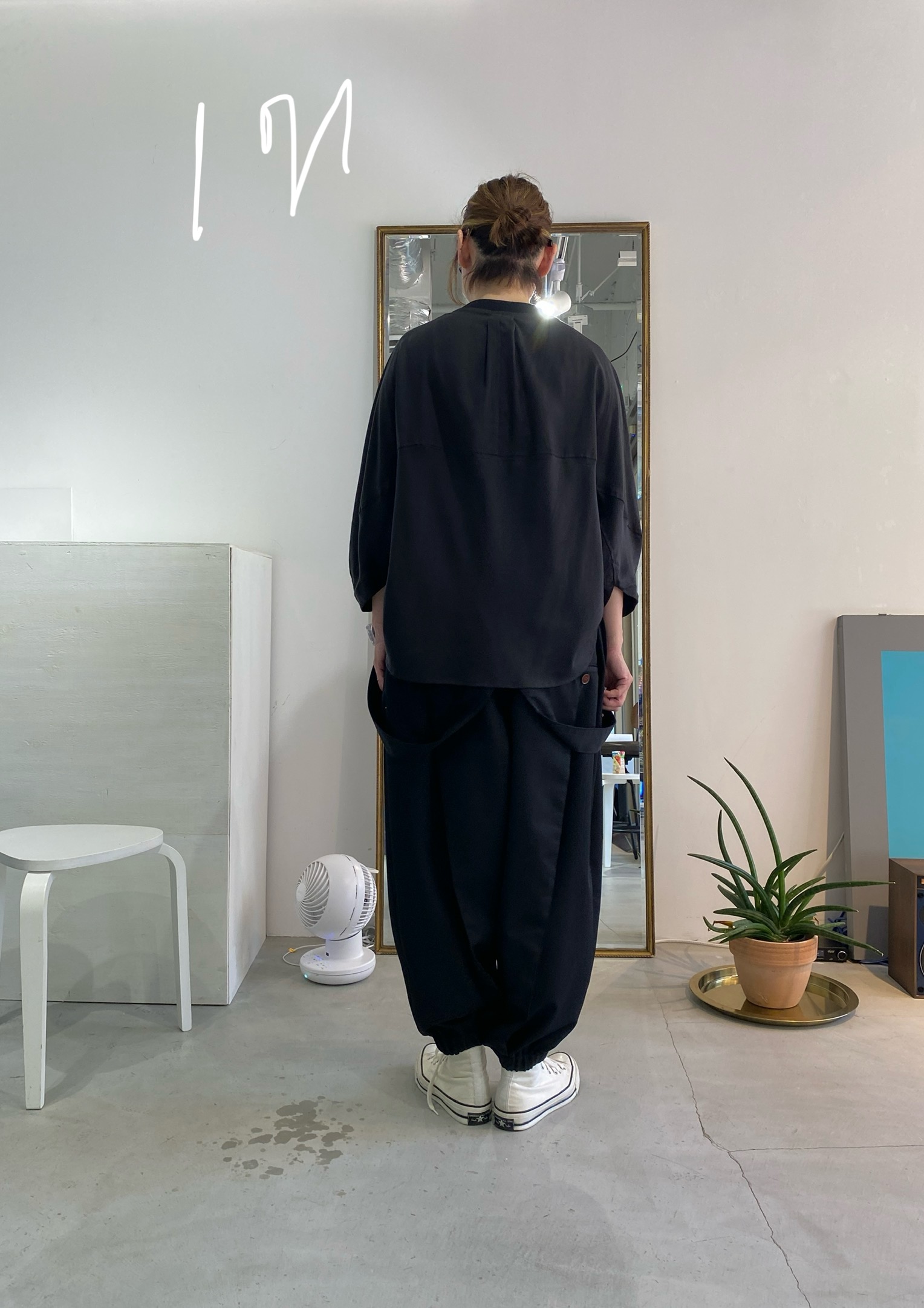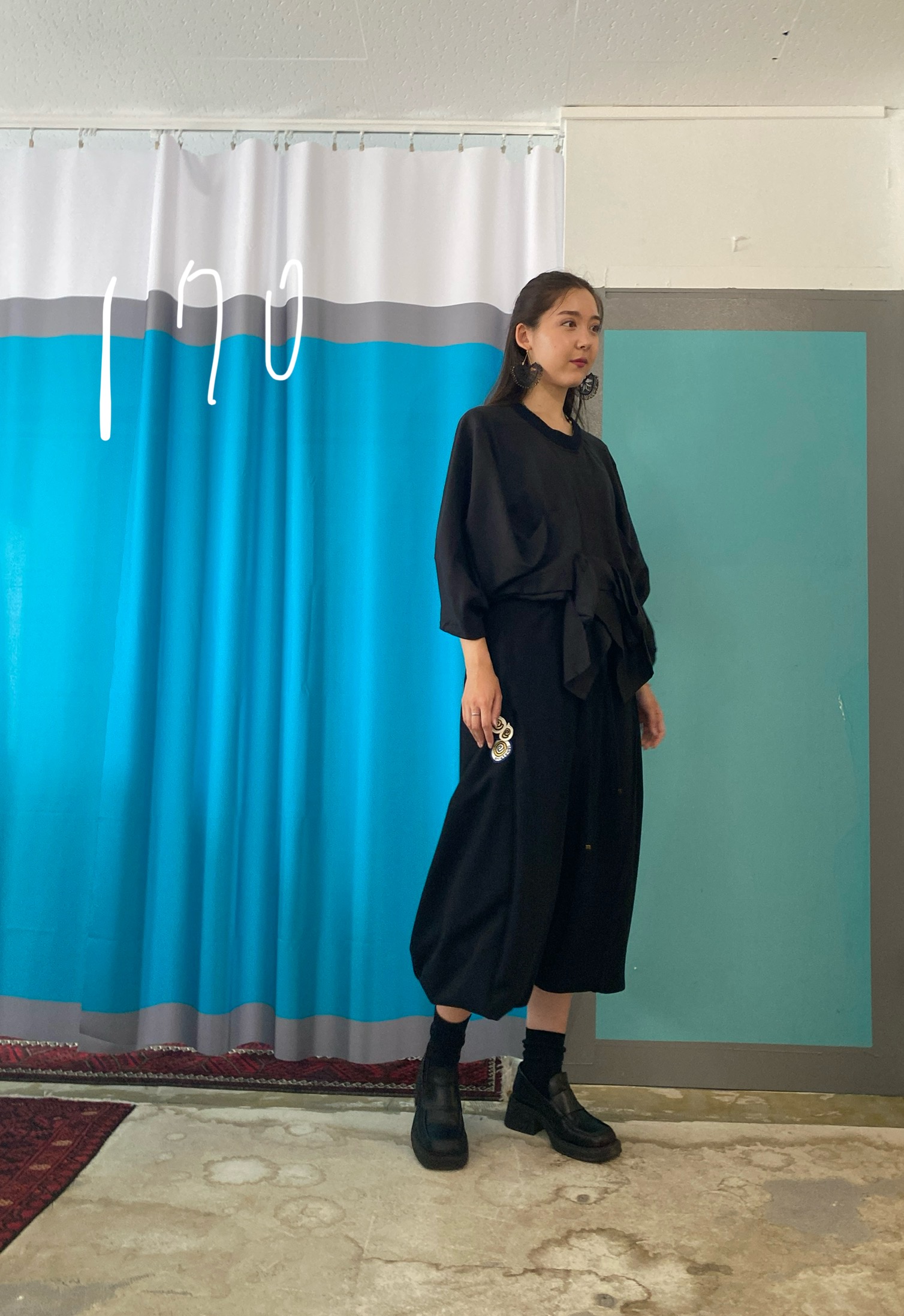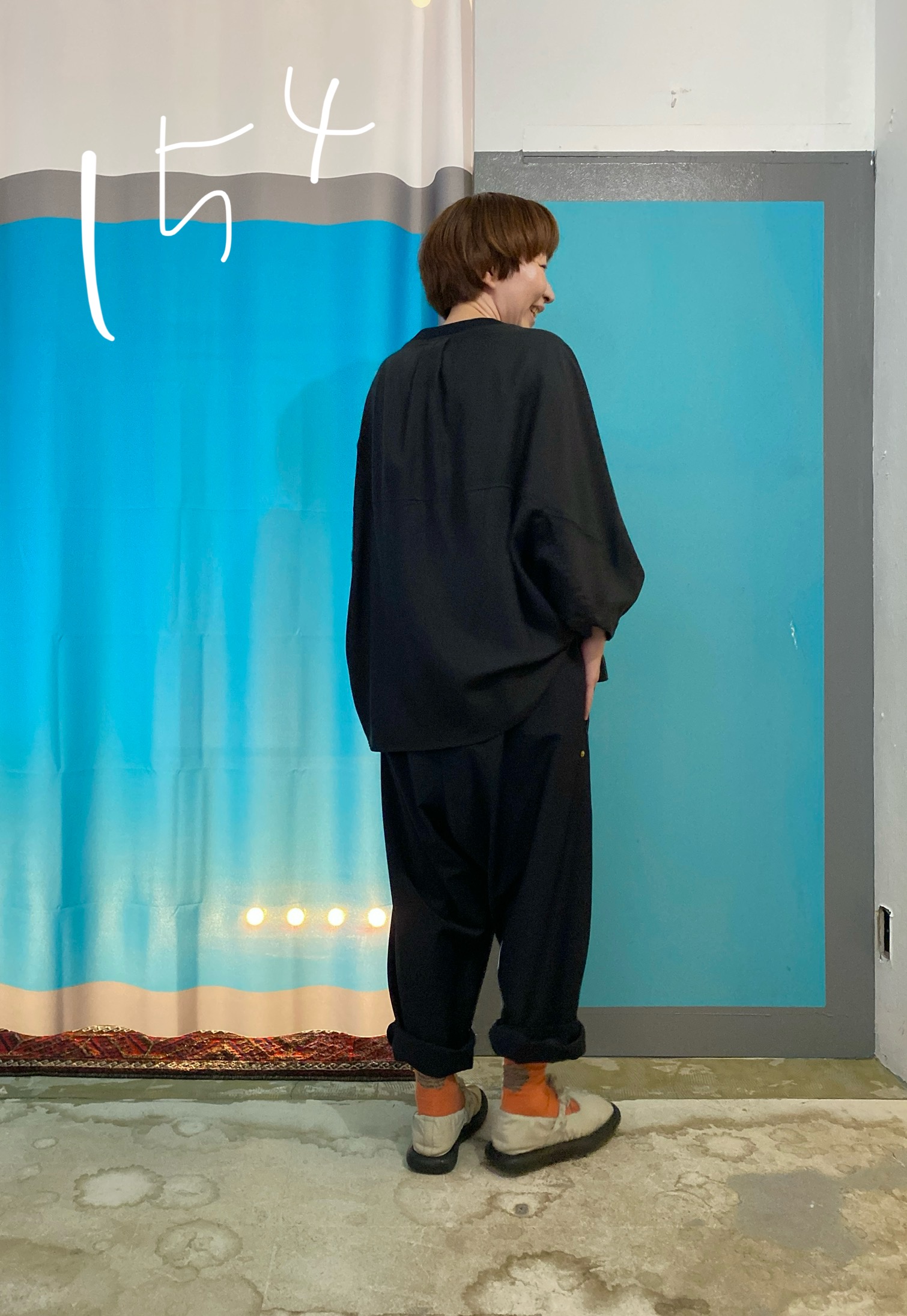 襟ぐりは同色のリブ。このことできちんと過ぎないカジュアル感のデザインになっています。