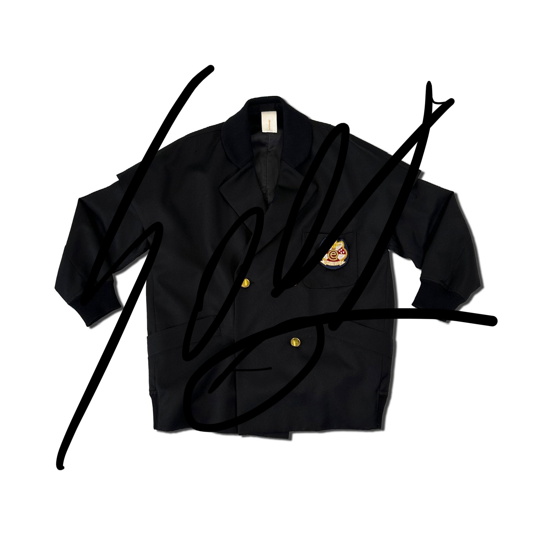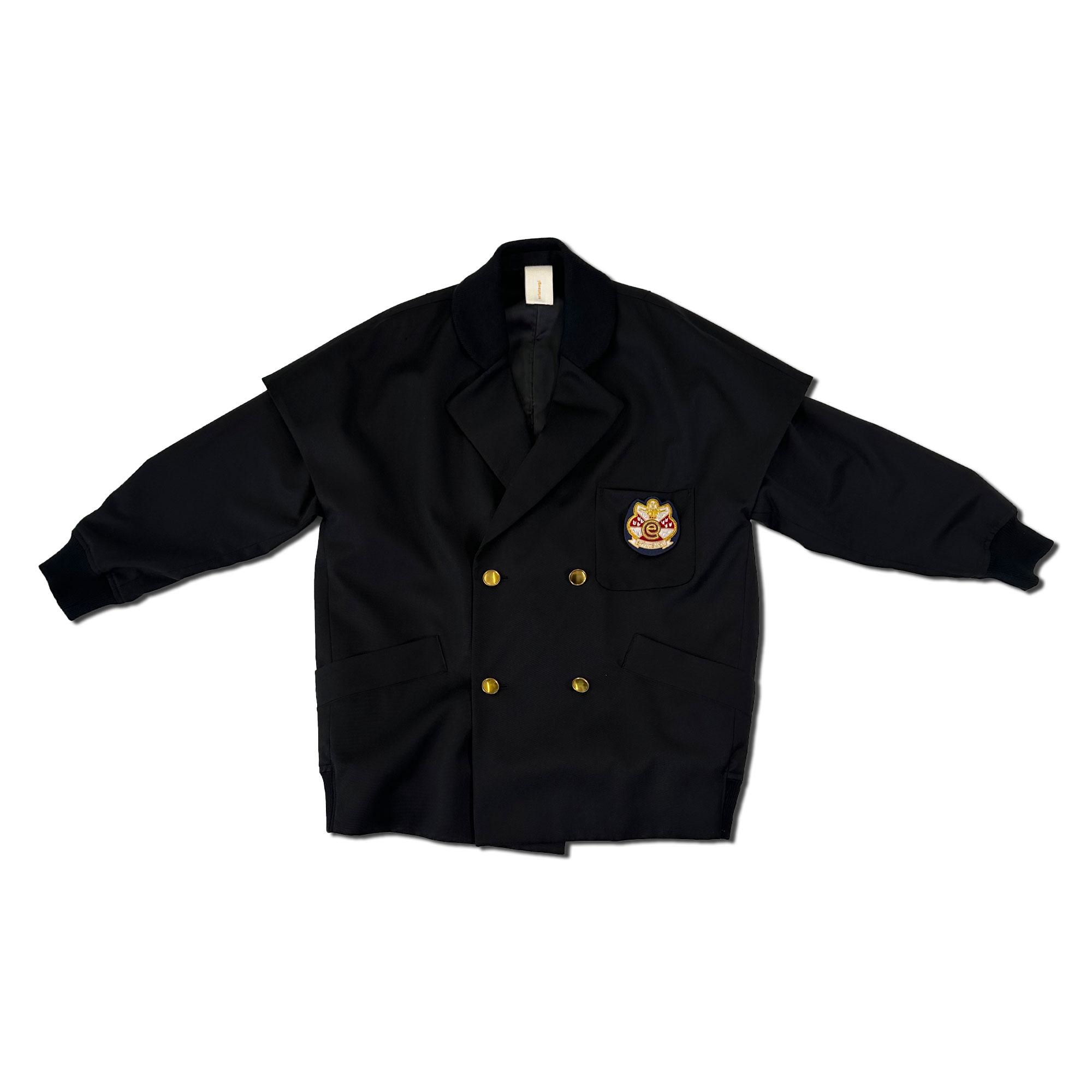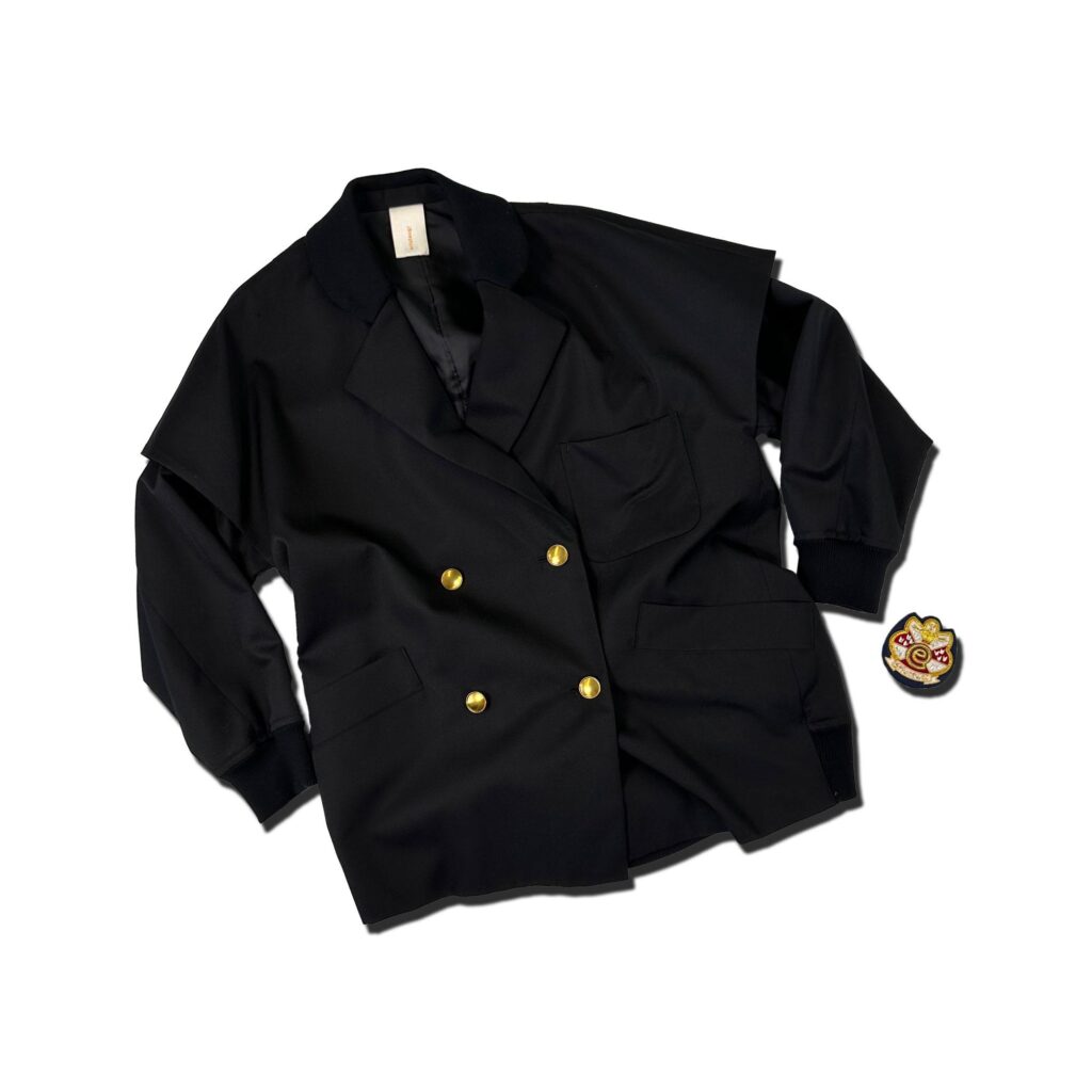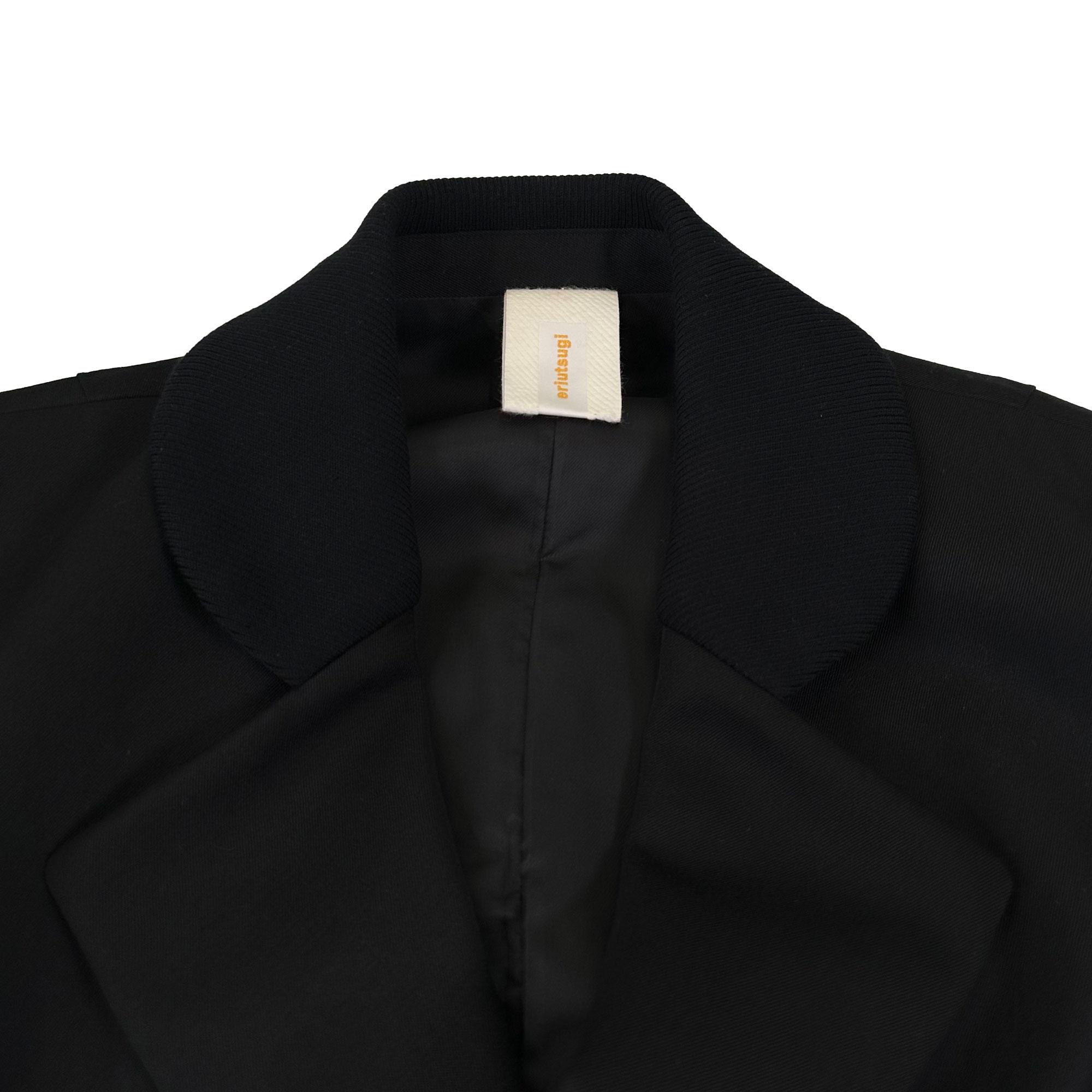 The ribbed back hem adds a casual touch to the jacket’s formal design.