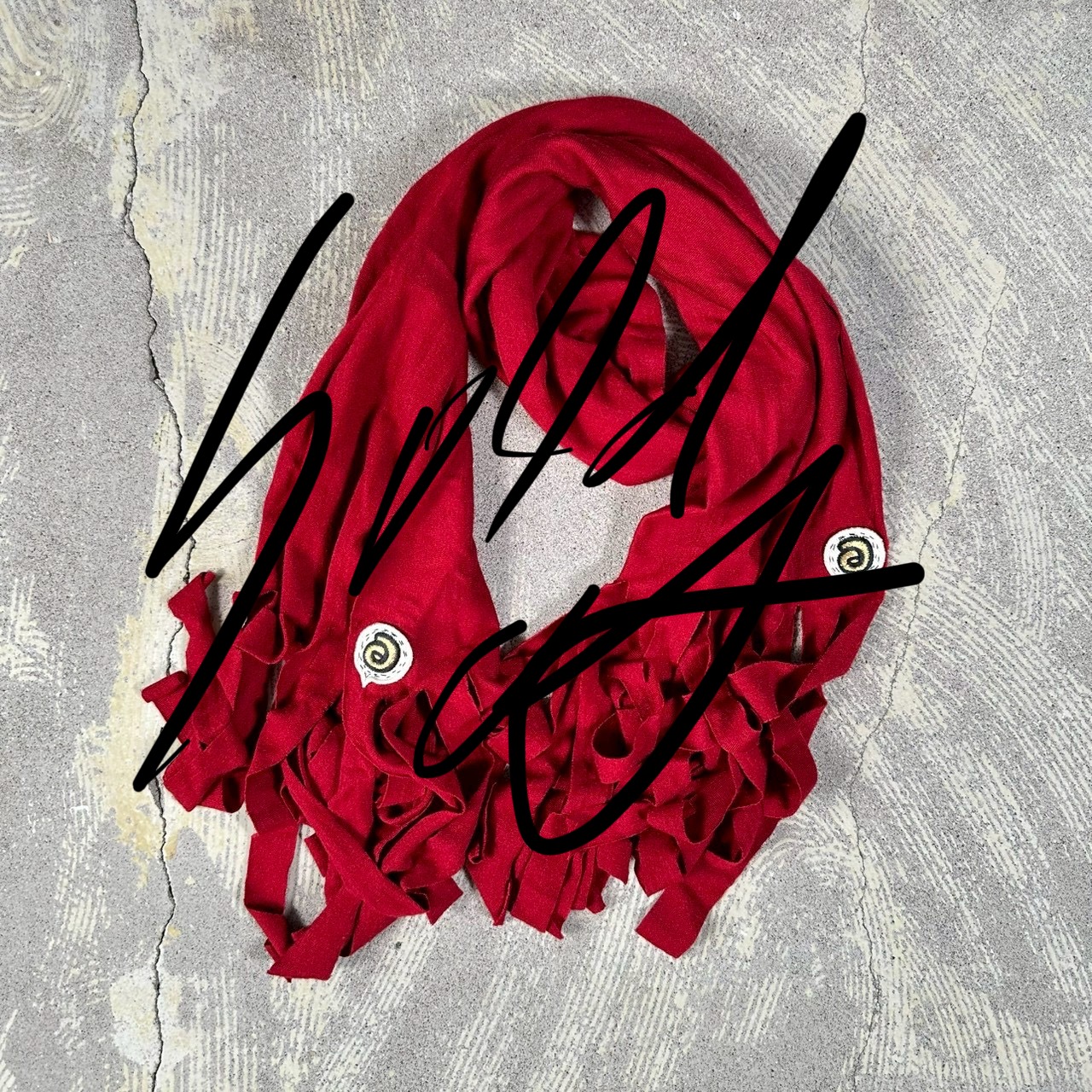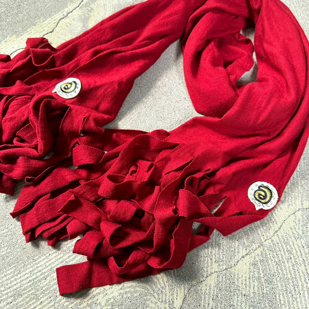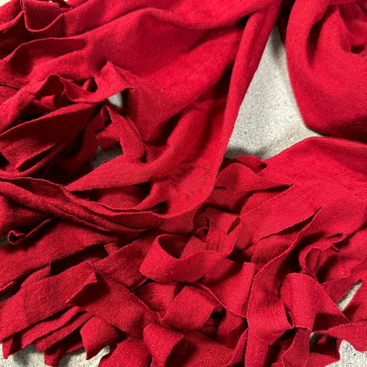 Made from 100% washable wool jersey, this scarf is soft, non-itchy, and can be gently hand-washed. This version is a single, long and narrow piece, with both ends cut to create fringes and hand-sewn patches on each side. The lightweight material makes it easy to wear like an accessory and convenient to carry around. Wishing you warmth and comfort through the cold winter days!! Ships immediately. 【Size】Length: 162cm / Width: 42cm 【Material】100% Wool 【Color】Red