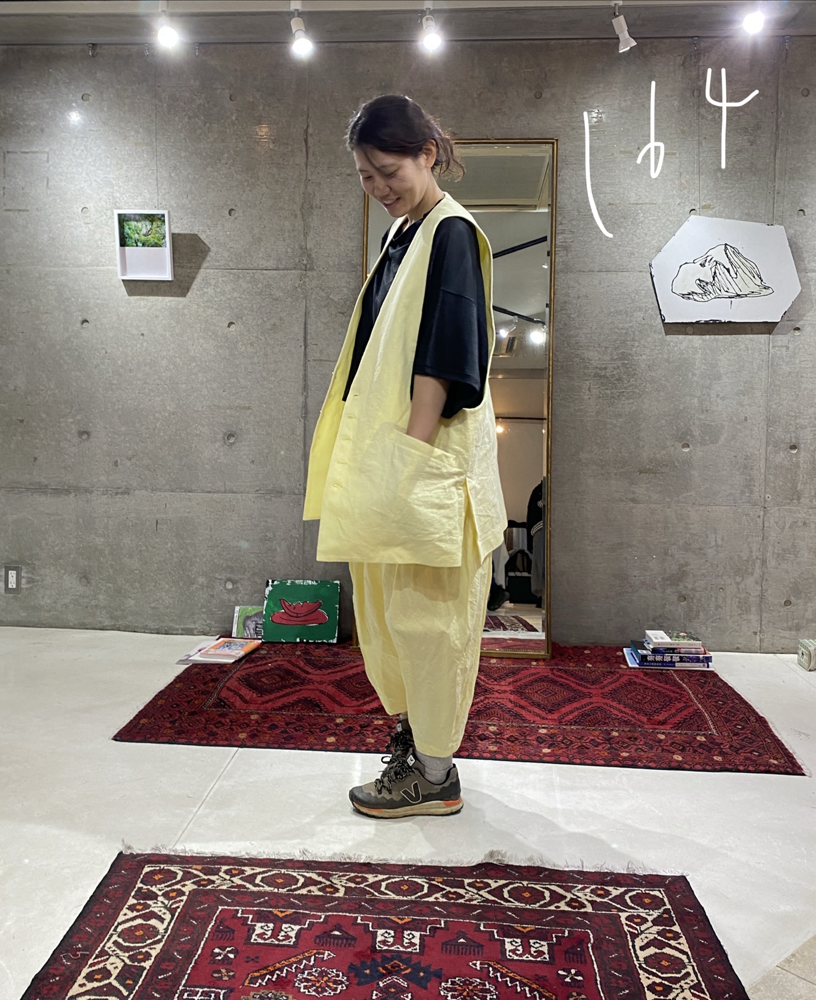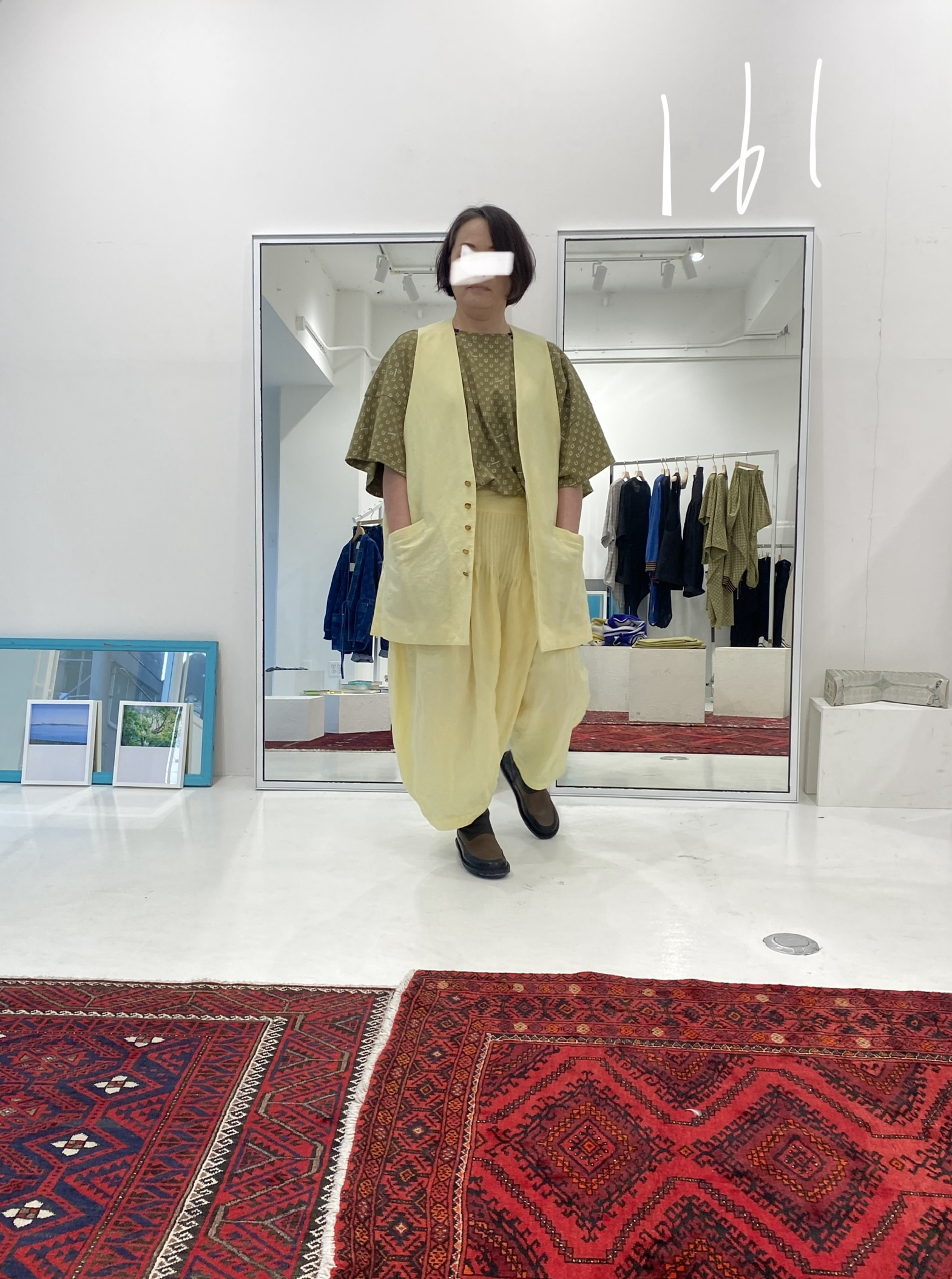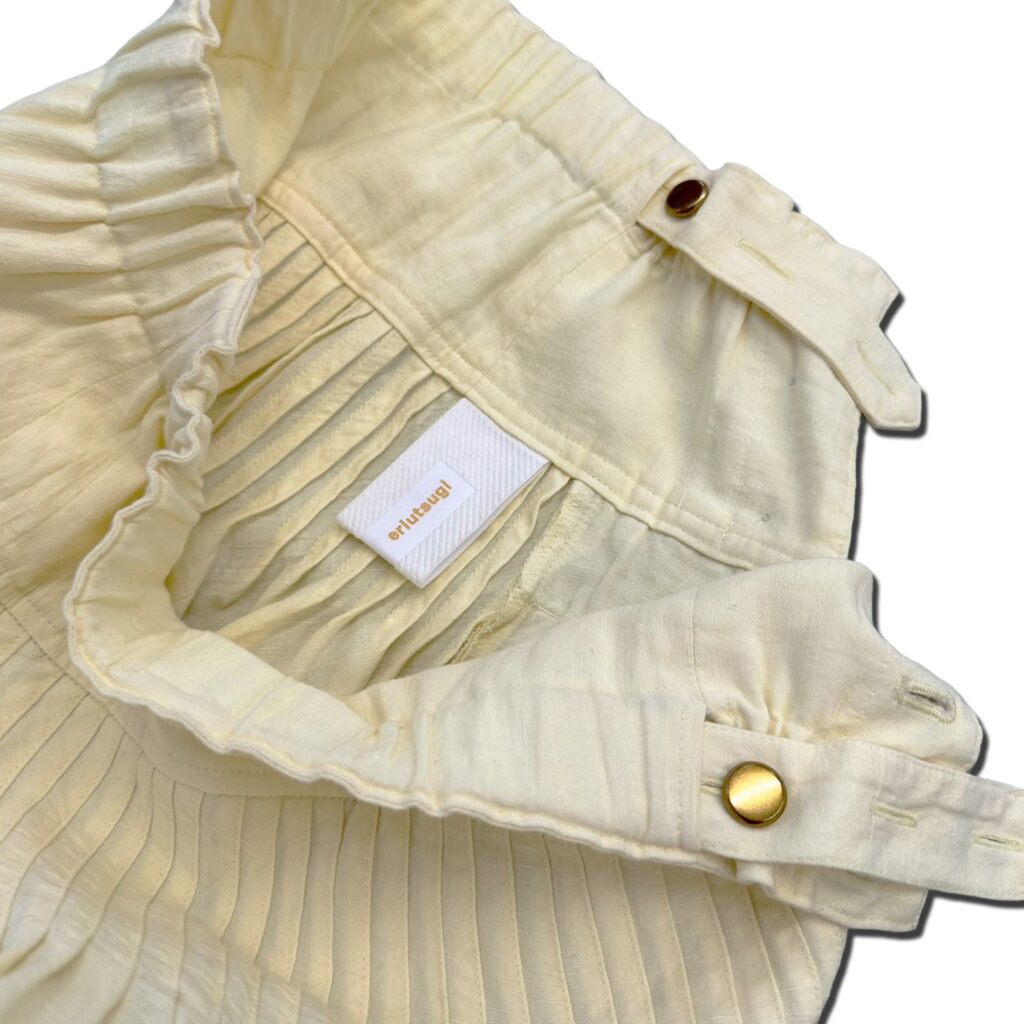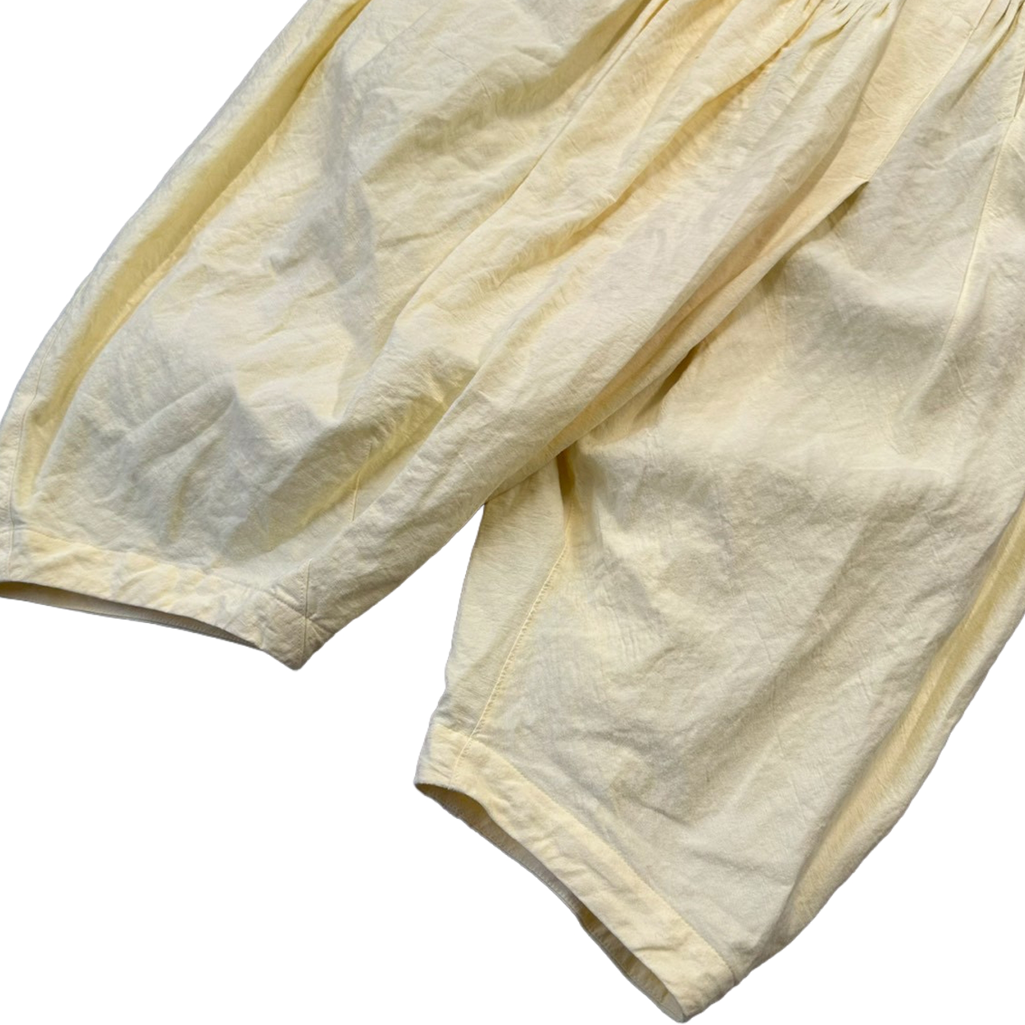 We crafted eriutsugi’s signature Theta pants silhouette in an elegant linen-cotton fabric. A lemon sherbet–like yellow — soft, gentle, with a subtle touch of playfulness. Bright yet refined, it lightens your look the moment you slip them on. Easier to style than you might expect, this shade refreshes your everyday wardrobe with a new sense of airiness. Generous fine tucks create rich volume, while the waist area is designed to appear clean and streamlined. Once worn, the balance naturally falls into place, creating a refined and elongated impression. The front features an overlapping diagonal design. The opening is finished with the same softly muted small gold metal buttons as the vest, adding a quiet accent. A washed finish enhances the natural beauty of the fabric, giving it a supple and expressive texture. The elastic waistband allows for adjustable comfort, fitting a wide range of sizes and designed to be worn unisex. The hems are slightly tapered. Petite wearers can roll them up for a light, balanced look, while taller wearers can enjoy the rounded silhouette as is. Perfect as a set with the vest, yet striking enough to stand beautifully on its own. We truly wanted to create pants with generous tucks. Though the construction required time and care, our makers embraced the idea and brought it to life with great dedication, resulting in a finish beyond what we imagined. A pair you will find yourself reaching for again and again. A beautiful yellow that will surely make you glad you chose to take the leap. Delivery: Around mid-June [Size] Total length 94cm Hip 112cm Rise 59cm Inseam 41cm Hem circumference 40–42cm Waist 70–86cm [Material] 50% Linen 50% Cotton [Color] Yellow