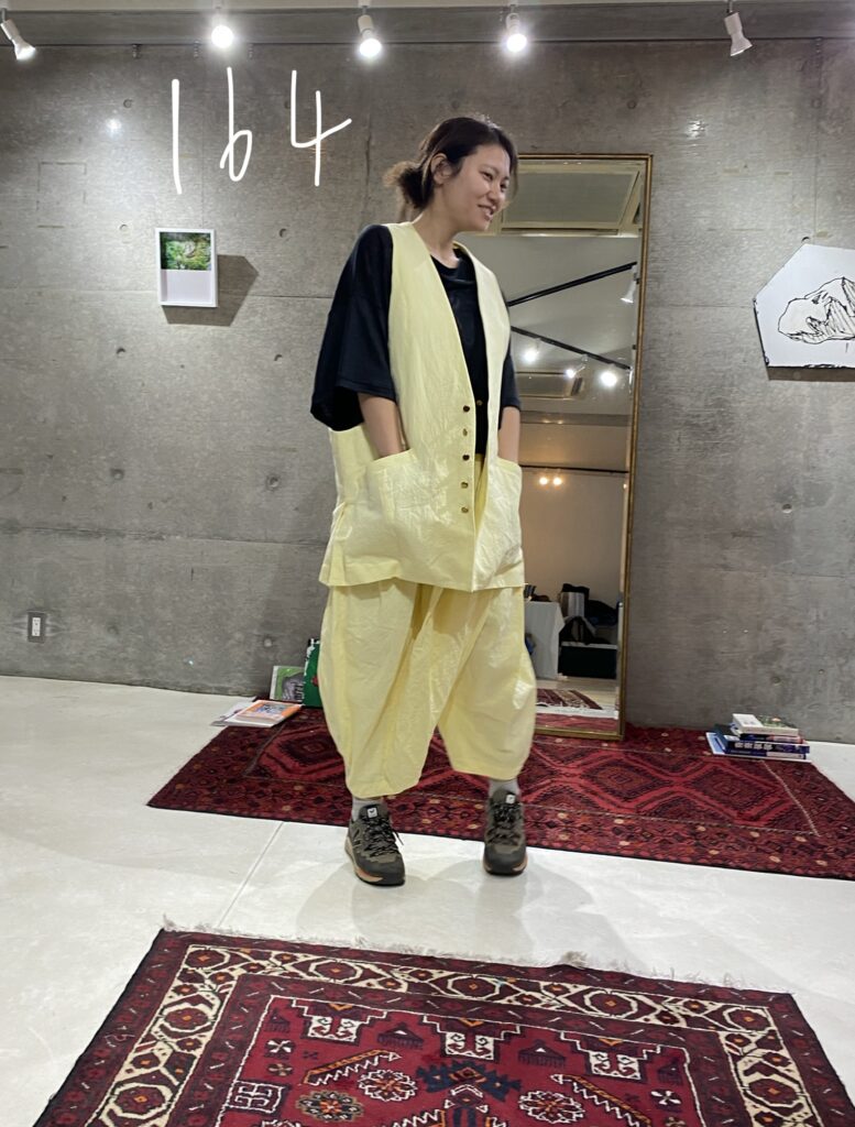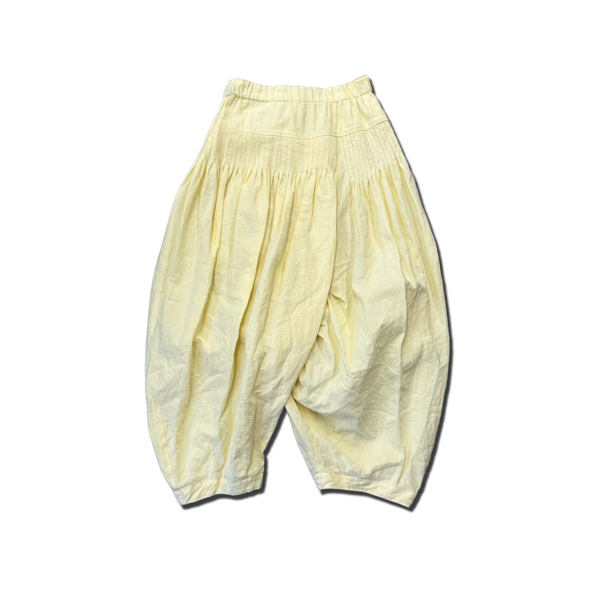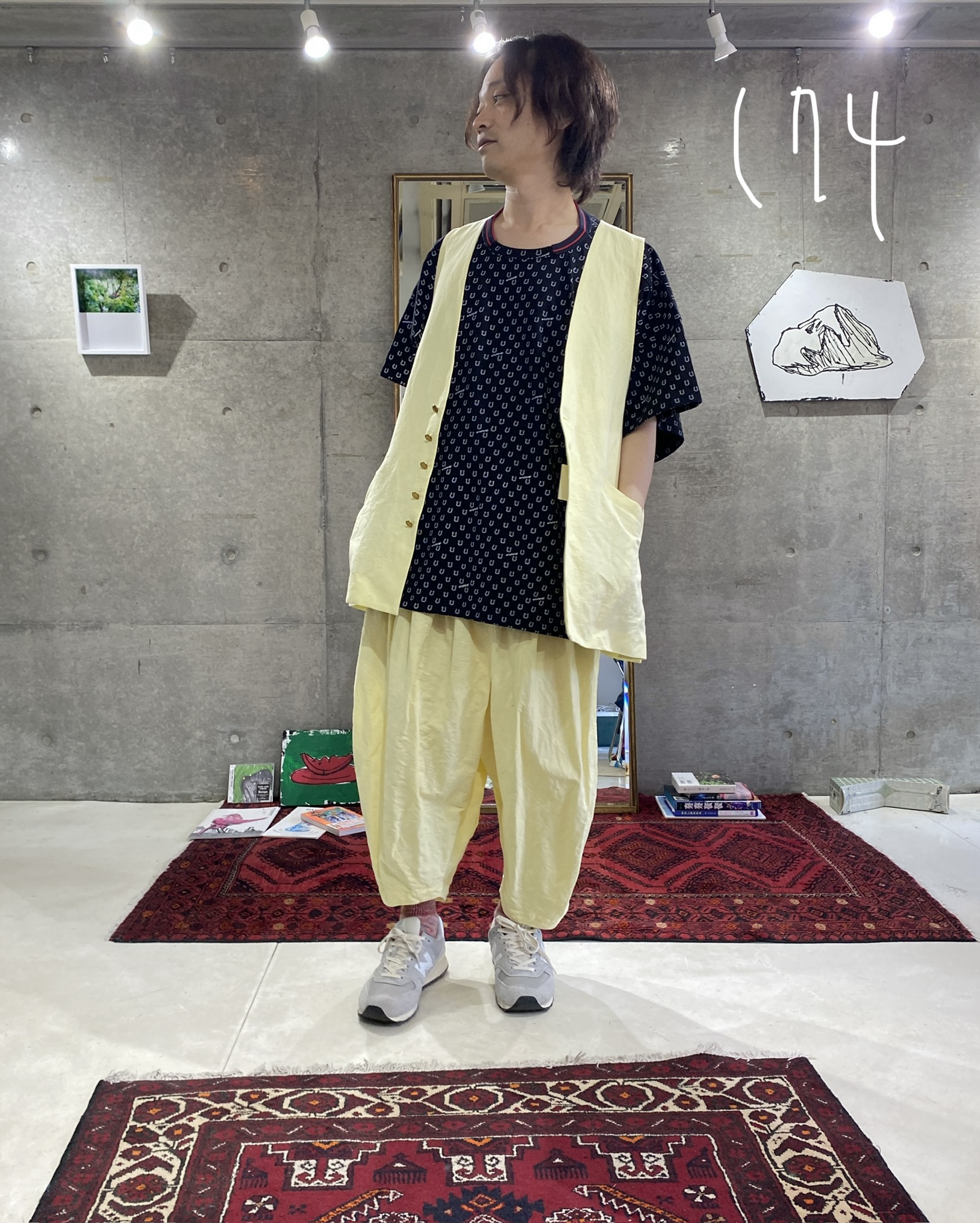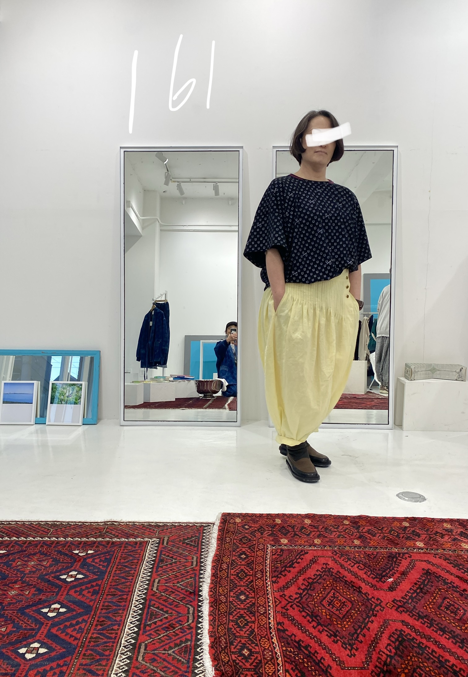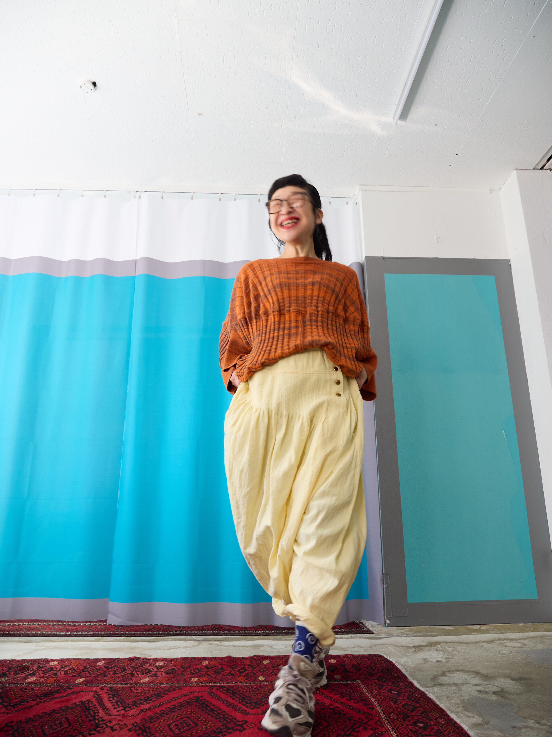 We crafted eriutsugi’s signature Theta pants silhouette in an elegant linen-cotton fabric. A lemon sherbet–like yellow — soft, gentle, with a subtle touch of playfulness. Bright yet refined, it lightens your look the moment you slip them on. Easier to style than you might expect, this shade refreshes your everyday wardrobe with a new sense of airiness. Generous fine tucks create rich volume, while the waist area is designed to appear clean and streamlined. Once worn, the balance naturally falls into place, creating a refined and elongated impression. The front features an overlapping diagonal design. The opening is finished with the same softly muted small gold metal buttons as the vest, adding a quiet accent. A washed finish enhances the natural beauty of the fabric, giving it a supple and expressive texture. The elastic waistband allows for adjustable comfort, fitting a wide range of sizes and designed to be worn unisex. The hems are slightly tapered. Petite wearers can roll them up for a light, balanced look, while taller wearers can enjoy the rounded silhouette as is. Perfect as a set with the vest, yet striking enough to stand beautifully on its own. We truly wanted to create pants with generous tucks. Though the construction required time and care, our makers embraced the idea and brought it to life with great dedication, resulting in a finish beyond what we imagined. A pair you will find yourself reaching for again and again. A beautiful yellow that will surely make you glad you chose to take the leap. Delivery: Around mid-June [Size] Total length 94cm Hip 112cm Rise 59cm Inseam 41cm Hem circumference 40–42cm Waist 70–86cm [Material] 50% Linen 50% Cotton [Color] Yellow