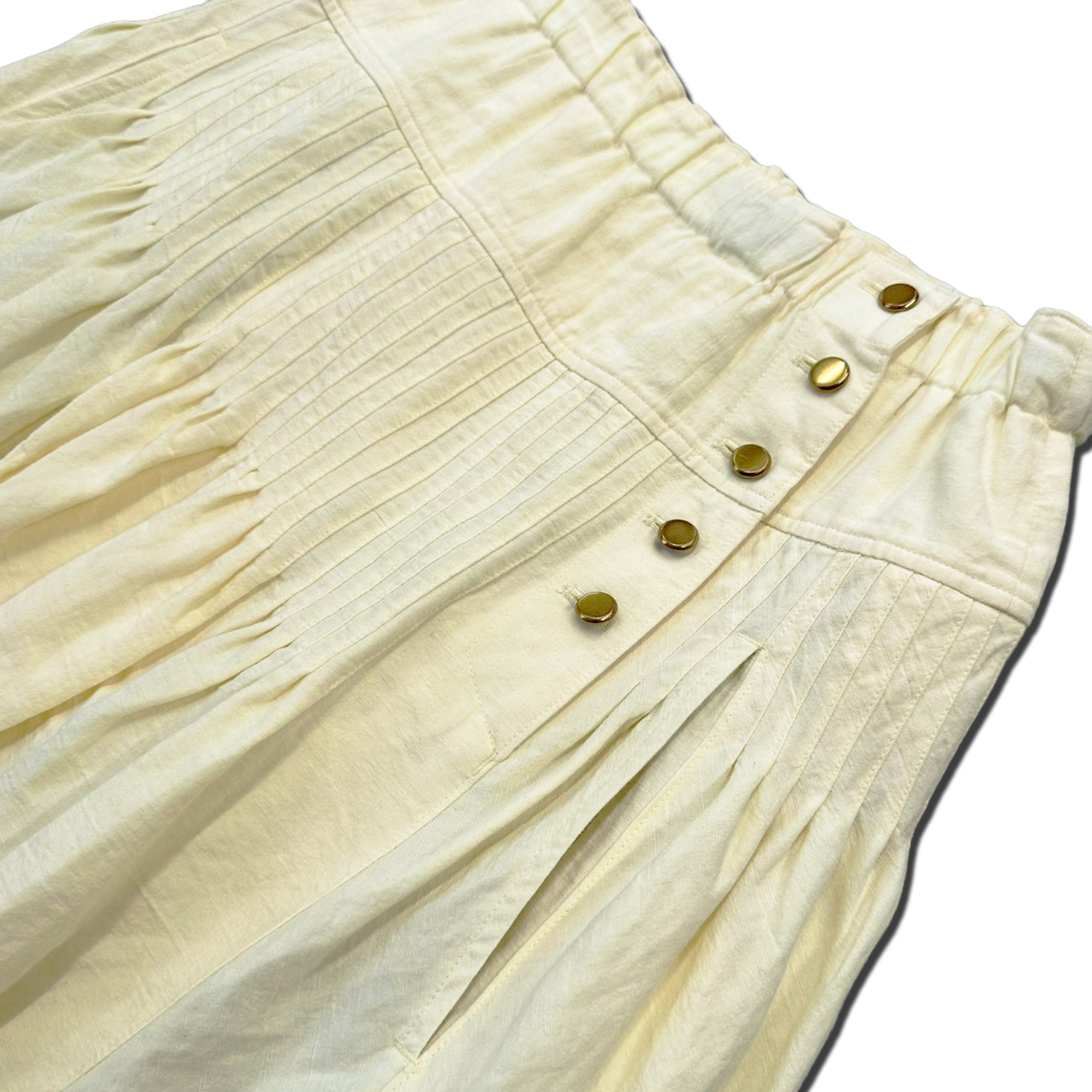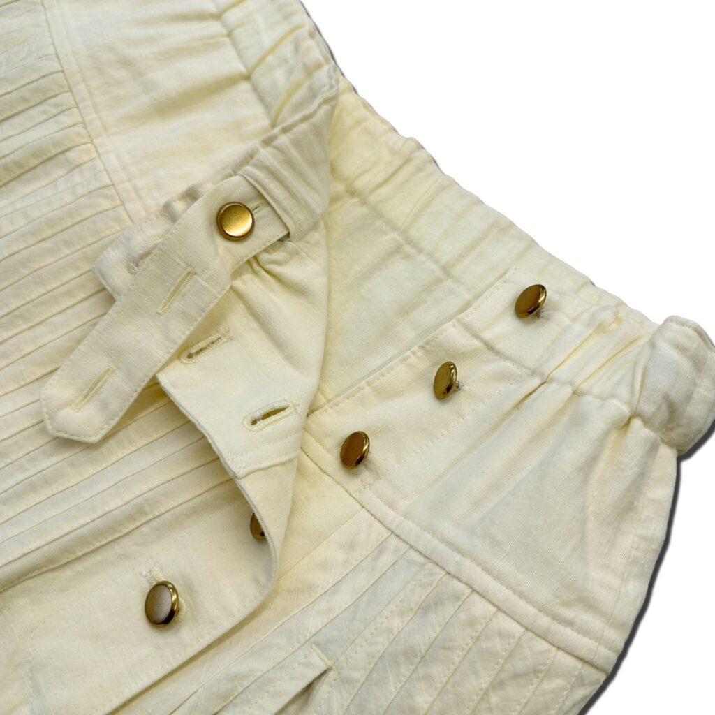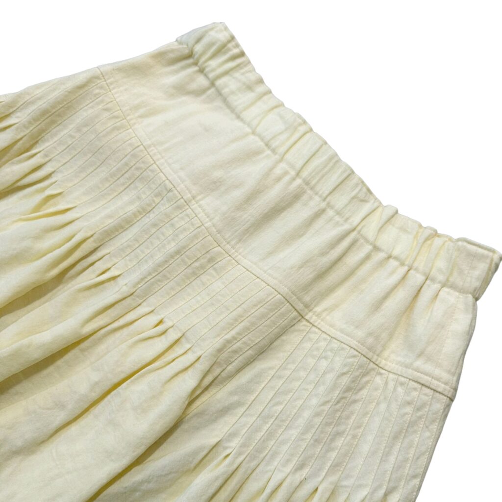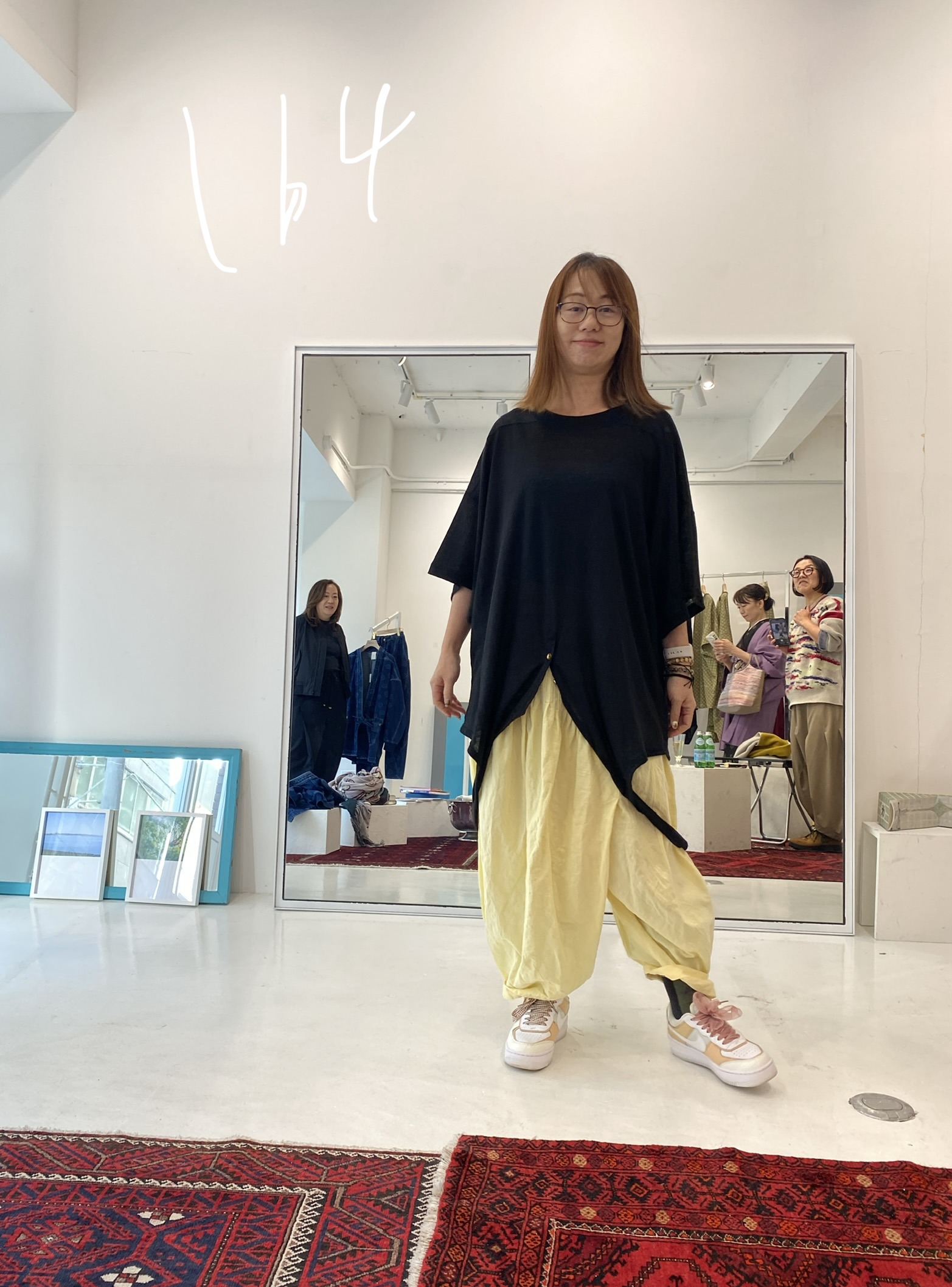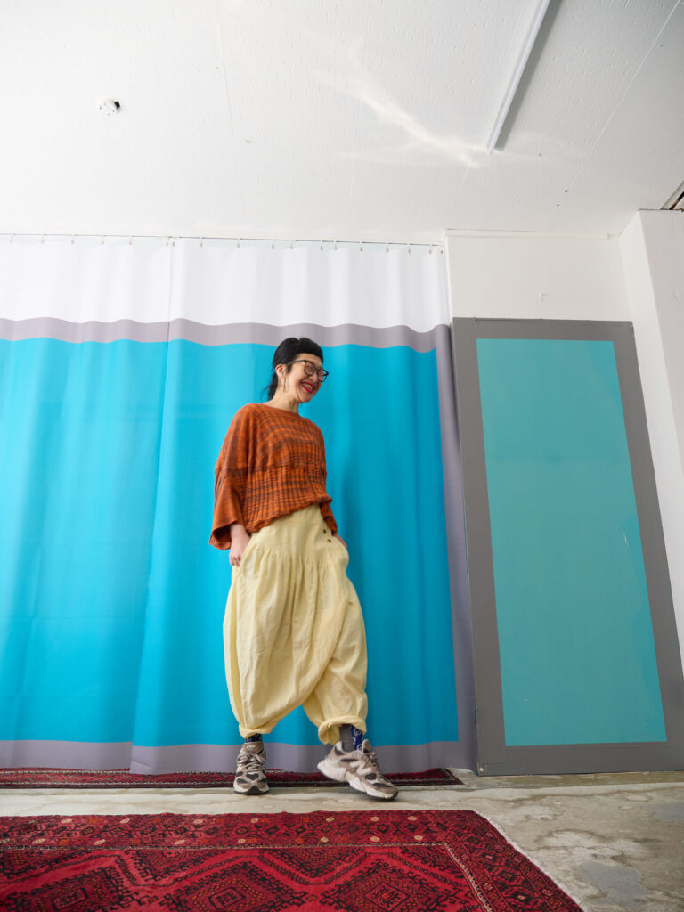 We crafted eriutsugi’s signature Theta pants silhouette in an elegant linen-cotton fabric. A lemon sherbet–like yellow — soft, gentle, with a subtle touch of playfulness. Bright yet refined, it lightens your look the moment you slip them on. Easier to style than you might expect, this shade refreshes your everyday wardrobe with a new sense of airiness. Generous fine tucks create rich volume, while the waist area is designed to appear clean and streamlined. Once worn, the balance naturally falls into place, creating a refined and elongated impression. The front features an overlapping diagonal design. The opening is finished with the same softly muted small gold metal buttons as the vest, adding a quiet accent. A washed finish enhances the natural beauty of the fabric, giving it a supple and expressive texture. The elastic waistband allows for adjustable comfort, fitting a wide range of sizes and designed to be worn unisex. The hems are slightly tapered. Petite wearers can roll them up for a light, balanced look, while taller wearers can enjoy the rounded silhouette as is. Perfect as a set with the vest, yet striking enough to stand beautifully on its own. We truly wanted to create pants with generous tucks. Though the construction required time and care, our makers embraced the idea and brought it to life with great dedication, resulting in a finish beyond what we imagined. A pair you will find yourself reaching for again and again. A beautiful yellow that will surely make you glad you chose to take the leap. Delivery: Around mid-June [Size] Total length 94cm Hip 112cm Rise 59cm Inseam 41cm Hem circumference 40–42cm Waist 70–86cm [Material] 50% Linen 50% Cotton [Color] Yellow