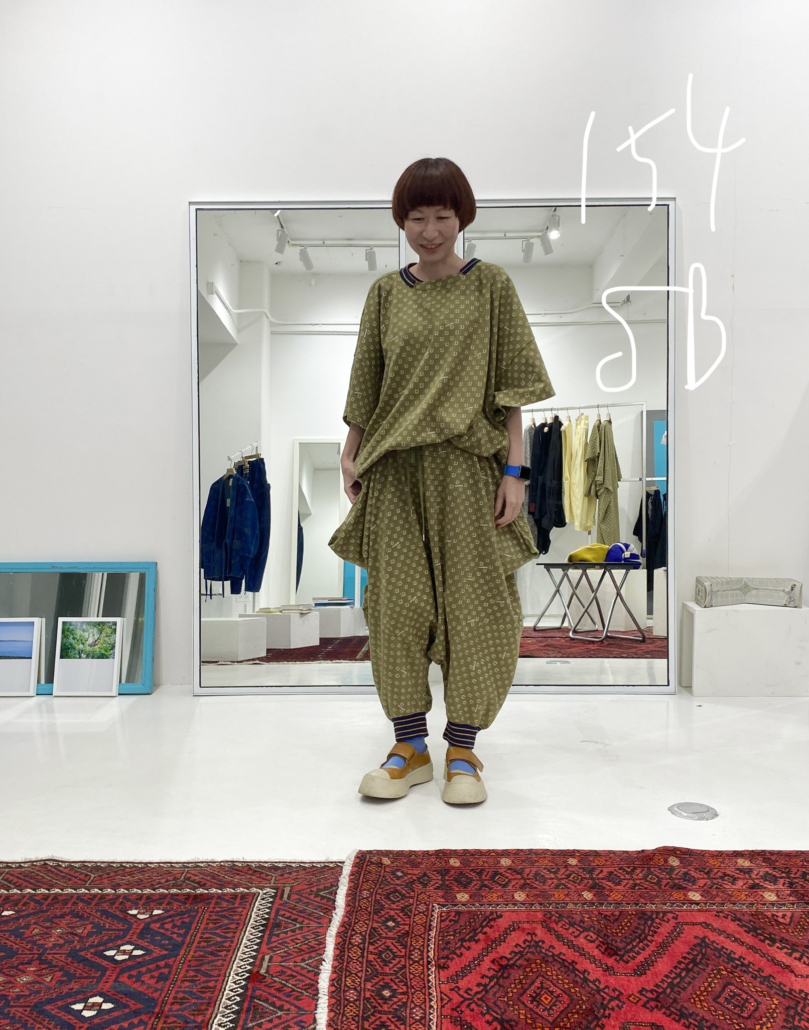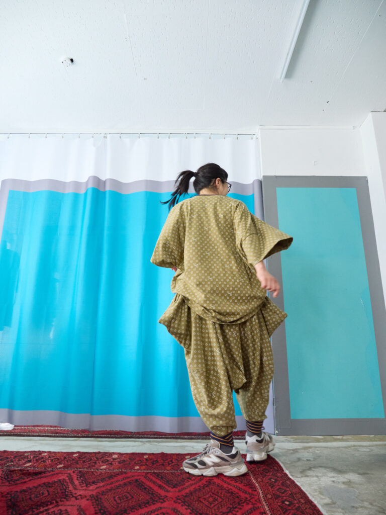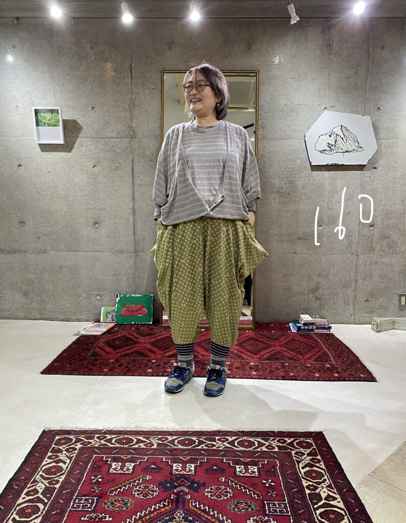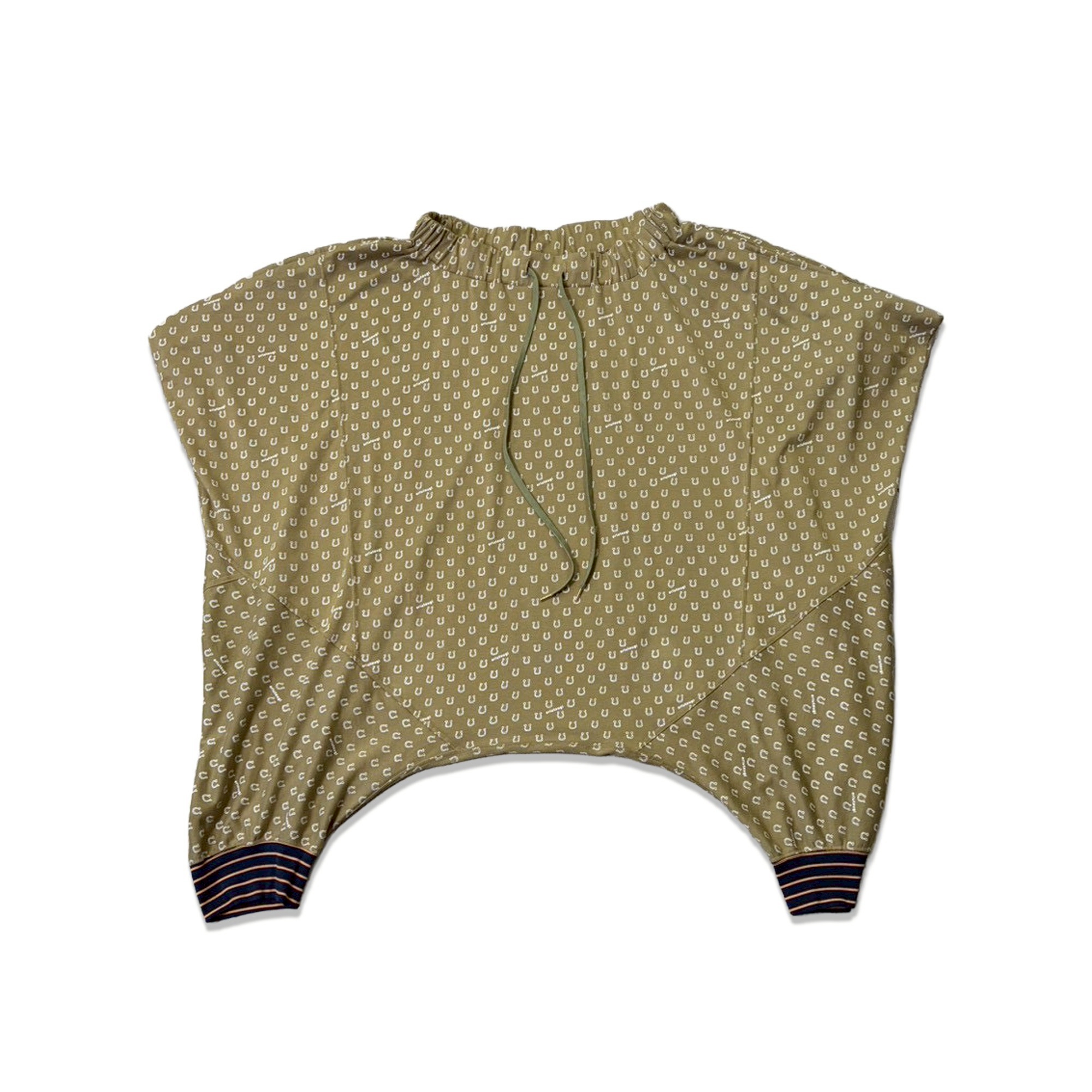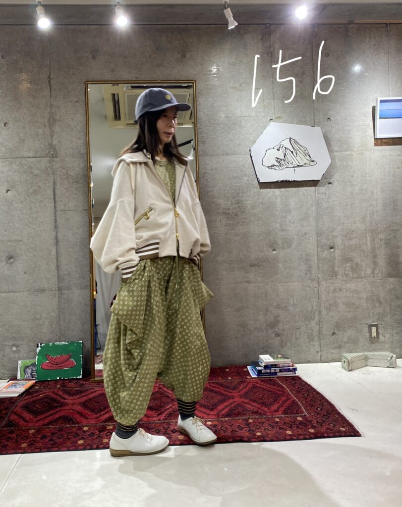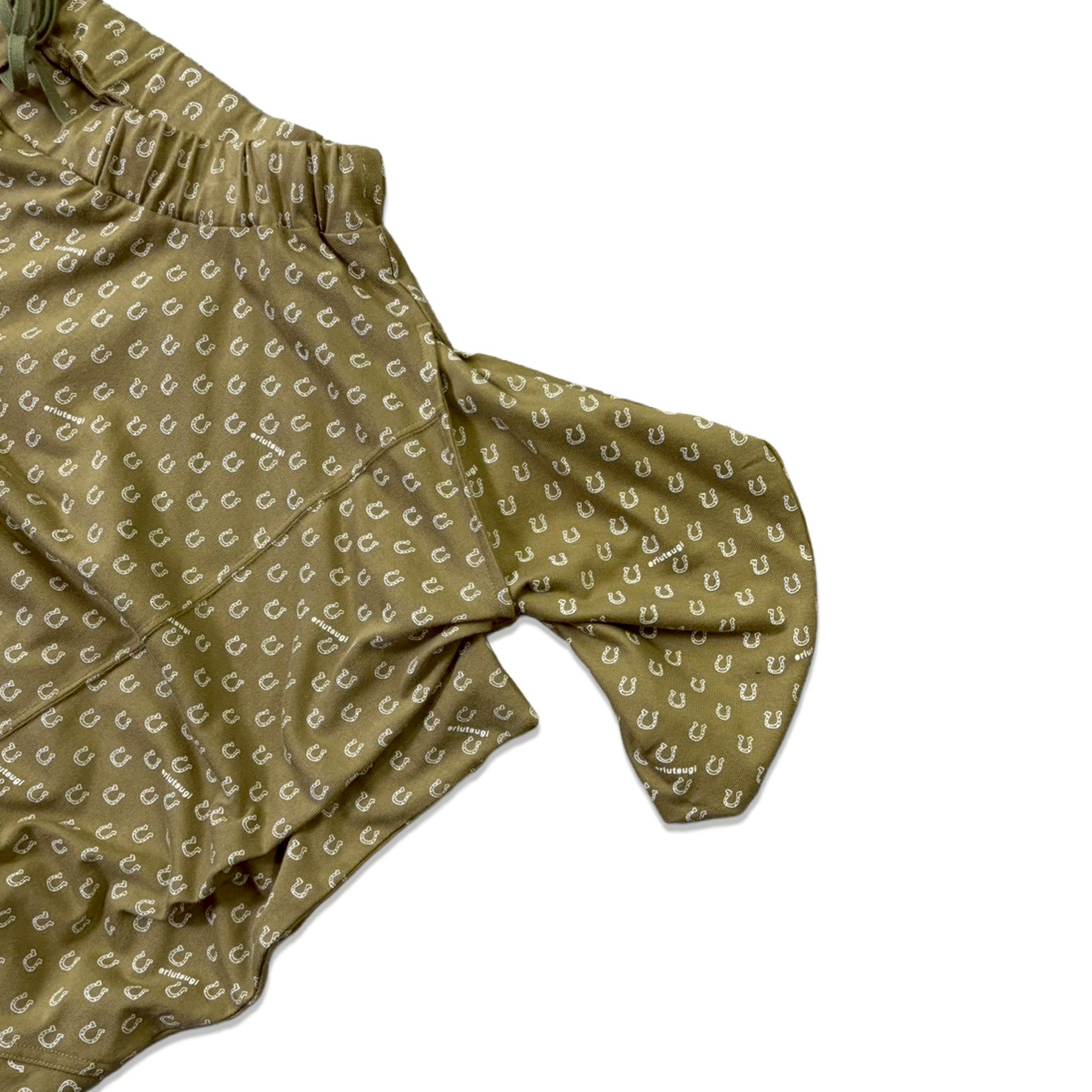 These are design pants made from cut-and-sew fabric, featuring an all-over horseshoe pattern arranged like dots. The dot pattern feels fresh, but instead of ordinary dots, we thought it would be fun to create an original dot pattern using horseshoe motifs—so we made it happen. It also has a subtle Japanese touch, finished with sporty accents through the line rib detailing. This is the Sage Green color. It pairs easily with black, of course, as well as white, denim, grey, lemon yellow, and orange. Even with other patterns, it goes especially well with black-and-white gingham. The waist is elastic with a drawstring. Wearing them barefoot with sandals creates a lovely resort-style look. Made from 100% cotton, they are also easy to care for. When rolled up, they can create a bloomer-like silhouette. With a very deep rise, they allow for easy movement—comfortable for bending and standing. Relaxed yet stylish, these are pants that let you enjoy summer with ease—uplifting and fun to wear ♡ Limited pre-order Delivery around mid-July 【Size】F Total length: 88 cm Hip: 190 cm Rise: 66 cm Inseam: 38 cm Hem circumference: 26 cm Waist (elastic): up to 112 cm 【Material】100% Organic Cotton [Rib] Cotton 78% / Nylon 18% / Polyurethane 4% 【Color】Sage Green