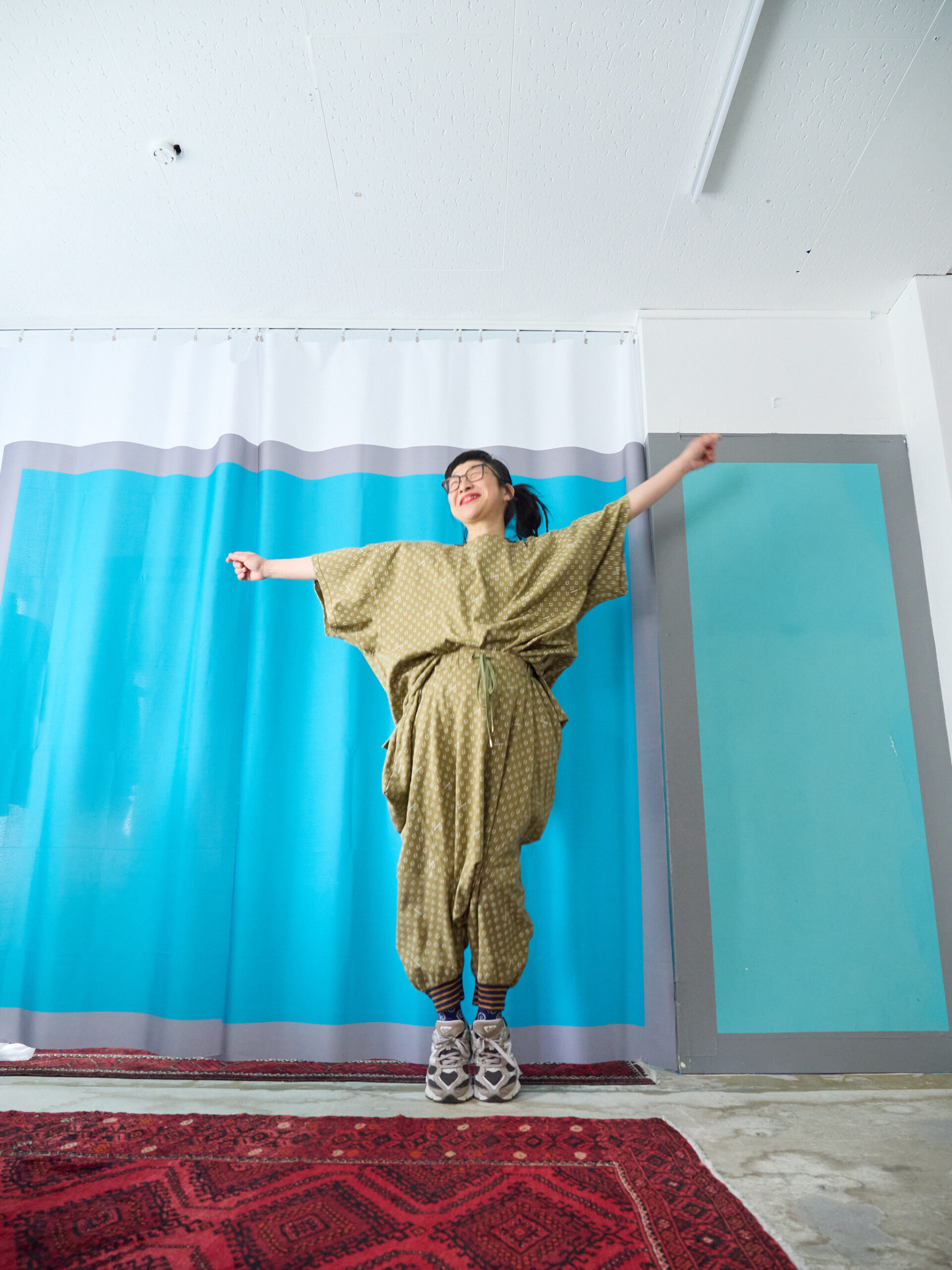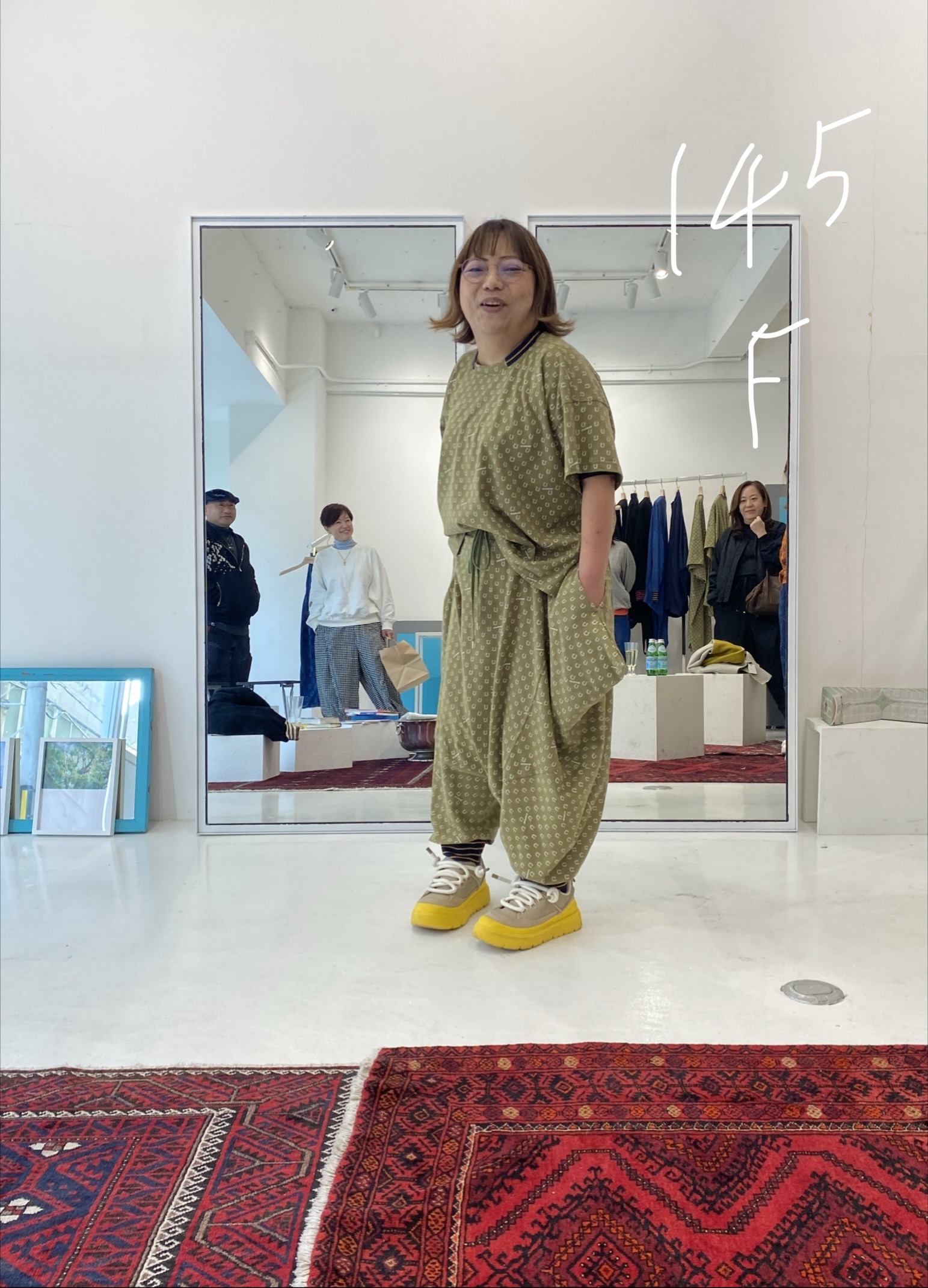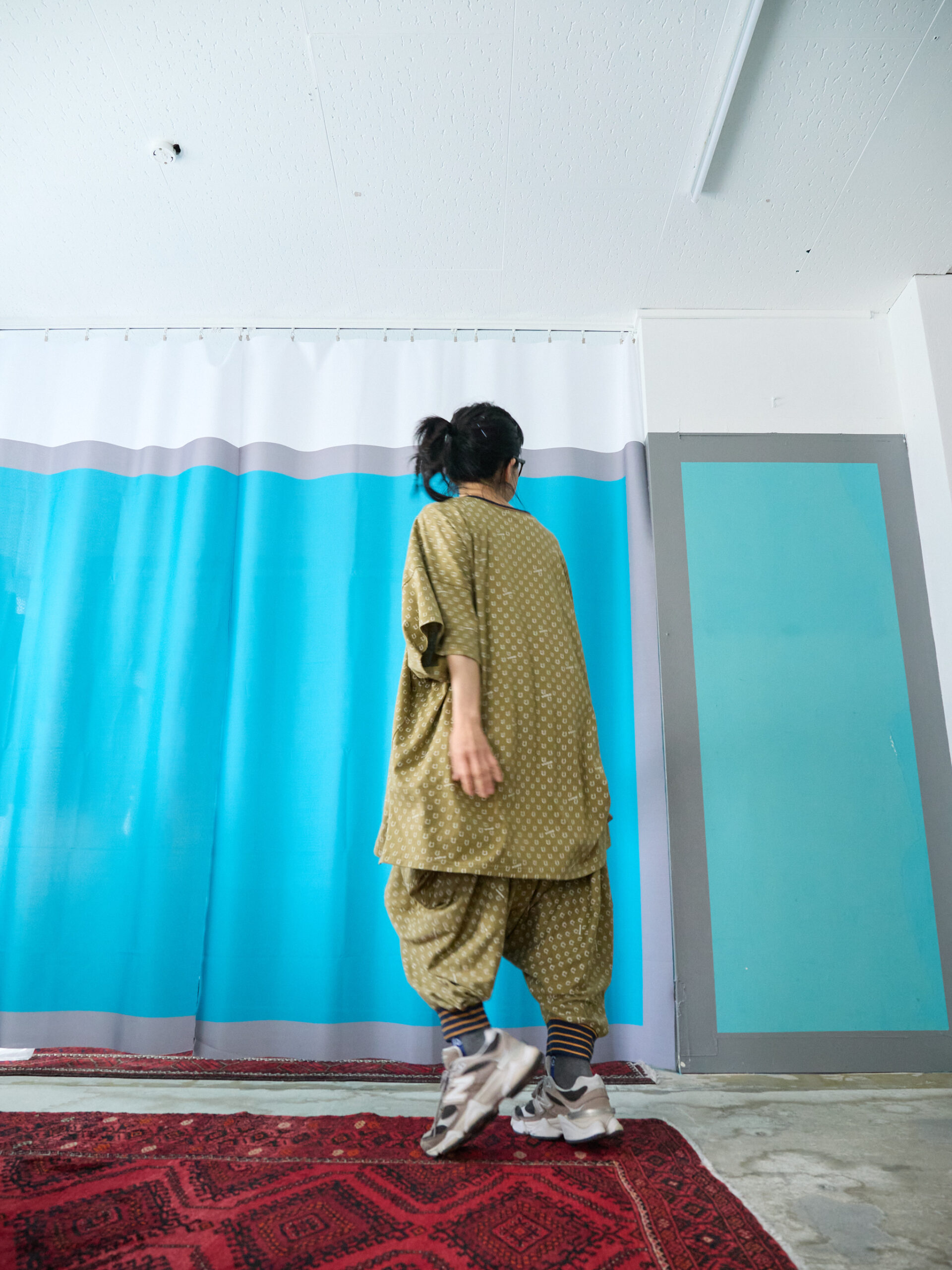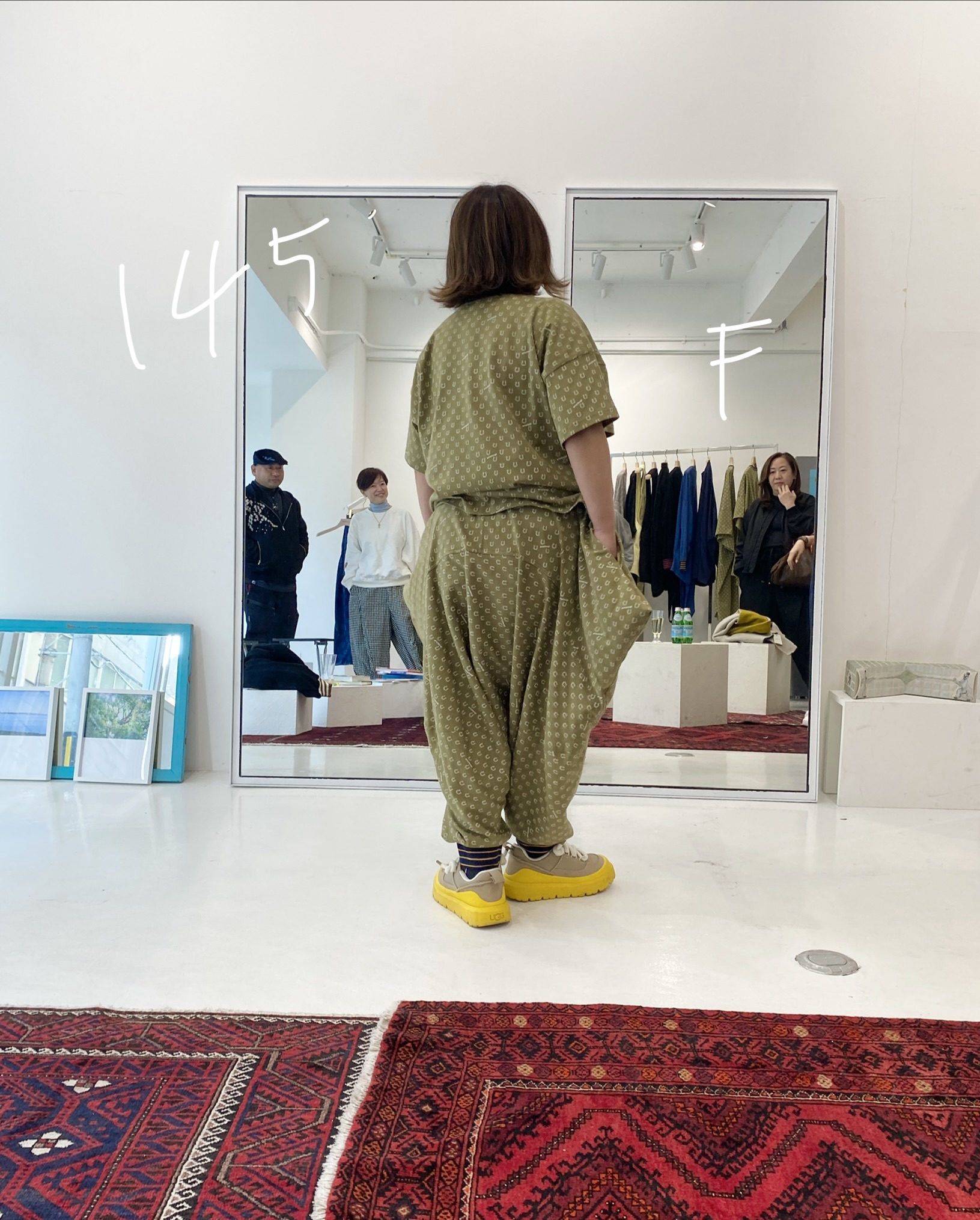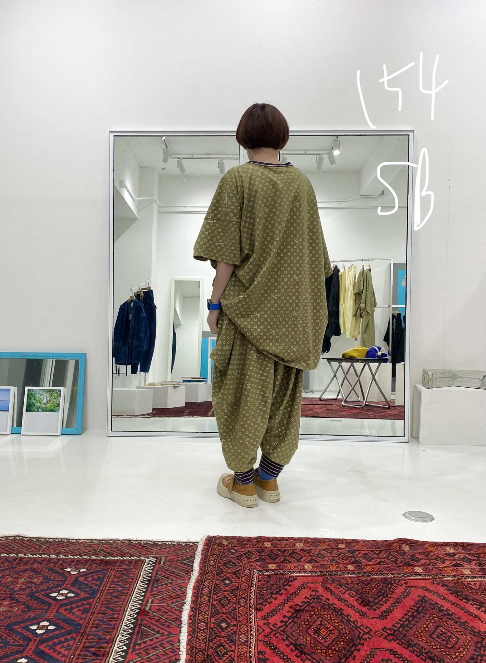 These are design pants made from cut-and-sew fabric, featuring an all-over horseshoe pattern arranged like dots. The dot pattern feels fresh, but instead of ordinary dots, we thought it would be fun to create an original dot pattern using horseshoe motifs—so we made it happen. It also has a subtle Japanese touch, finished with sporty accents through the line rib detailing. This is the Sage Green color. It pairs easily with black, of course, as well as white, denim, grey, lemon yellow, and orange. Even with other patterns, it goes especially well with black-and-white gingham. The waist is elastic with a drawstring. Wearing them barefoot with sandals creates a lovely resort-style look. Made from 100% cotton, they are also easy to care for. When rolled up, they can create a bloomer-like silhouette. With a very deep rise, they allow for easy movement—comfortable for bending and standing. Relaxed yet stylish, these are pants that let you enjoy summer with ease—uplifting and fun to wear ♡ Limited pre-order Delivery around mid-July 【Size】F Total length: 88 cm Hip: 190 cm Rise: 66 cm Inseam: 38 cm Hem circumference: 26 cm Waist (elastic): up to 112 cm 【Material】100% Organic Cotton [Rib] Cotton 78% / Nylon 18% / Polyurethane 4% 【Color】Sage Green