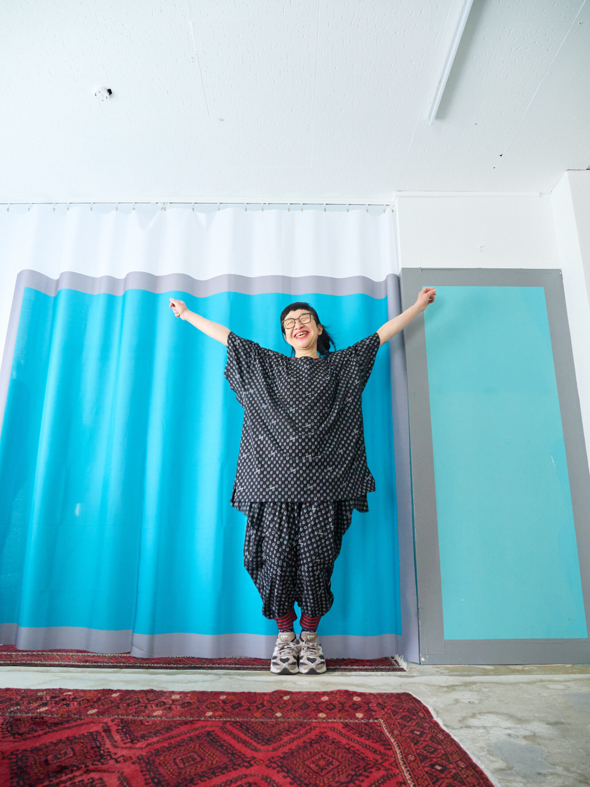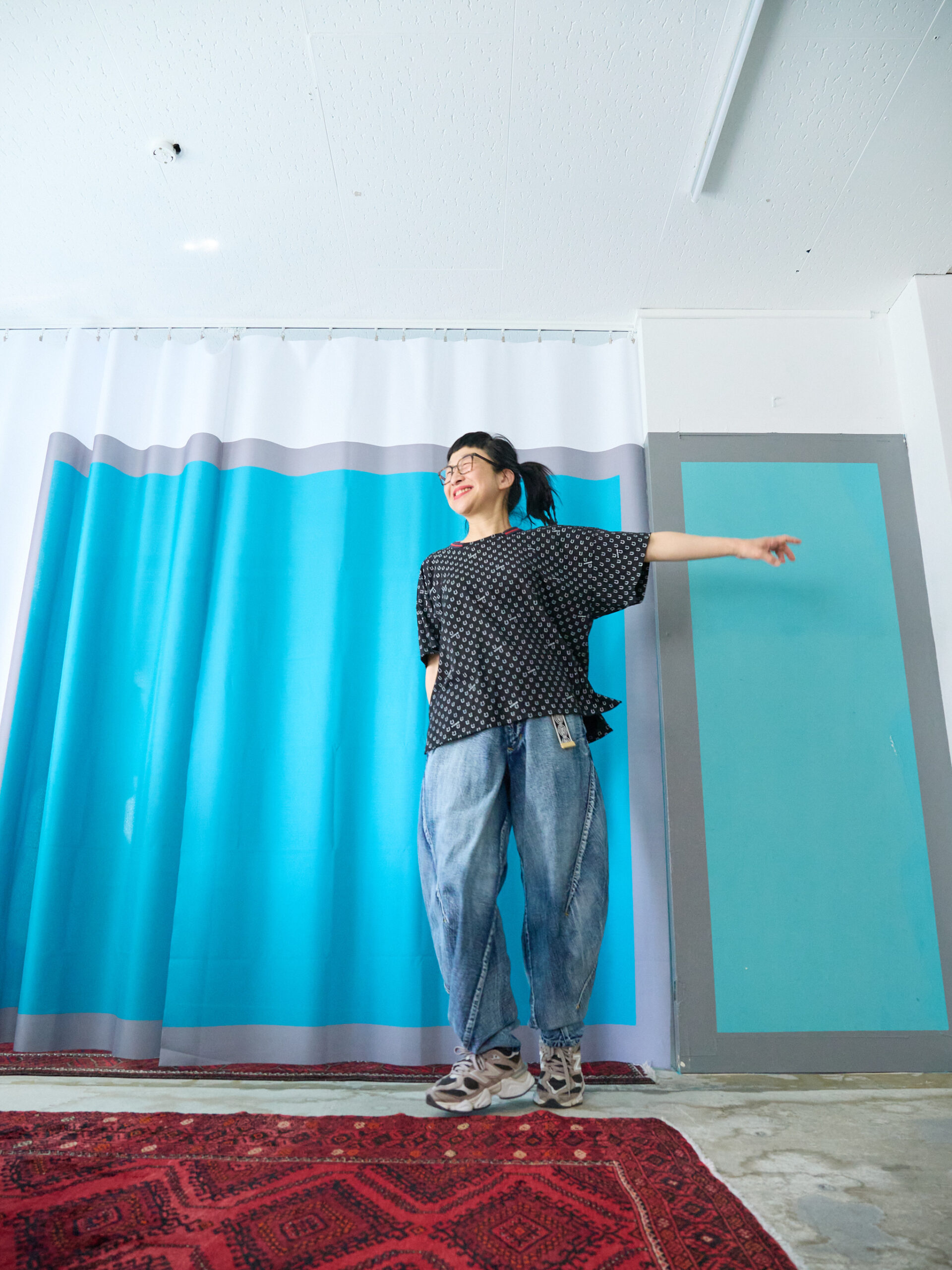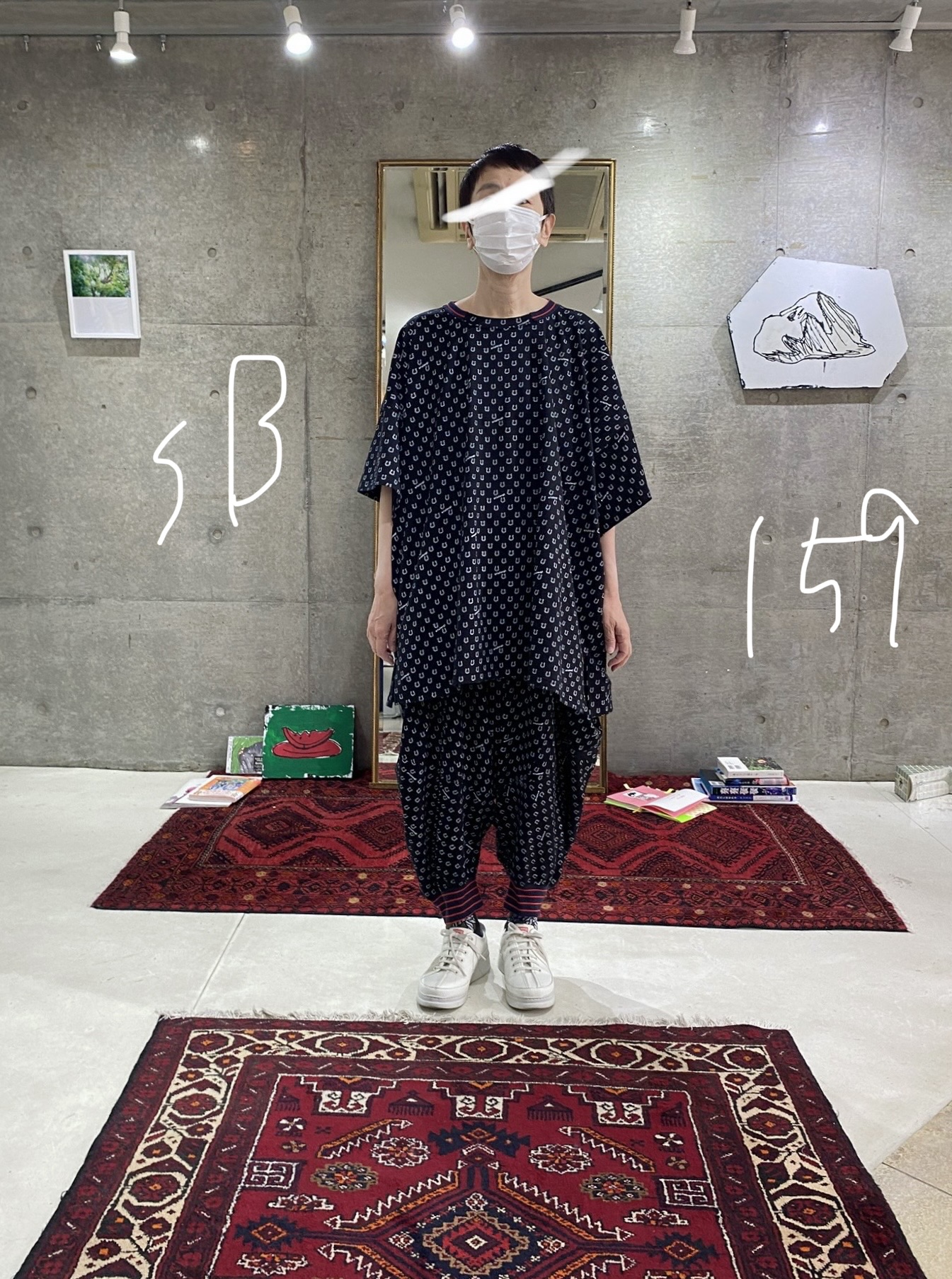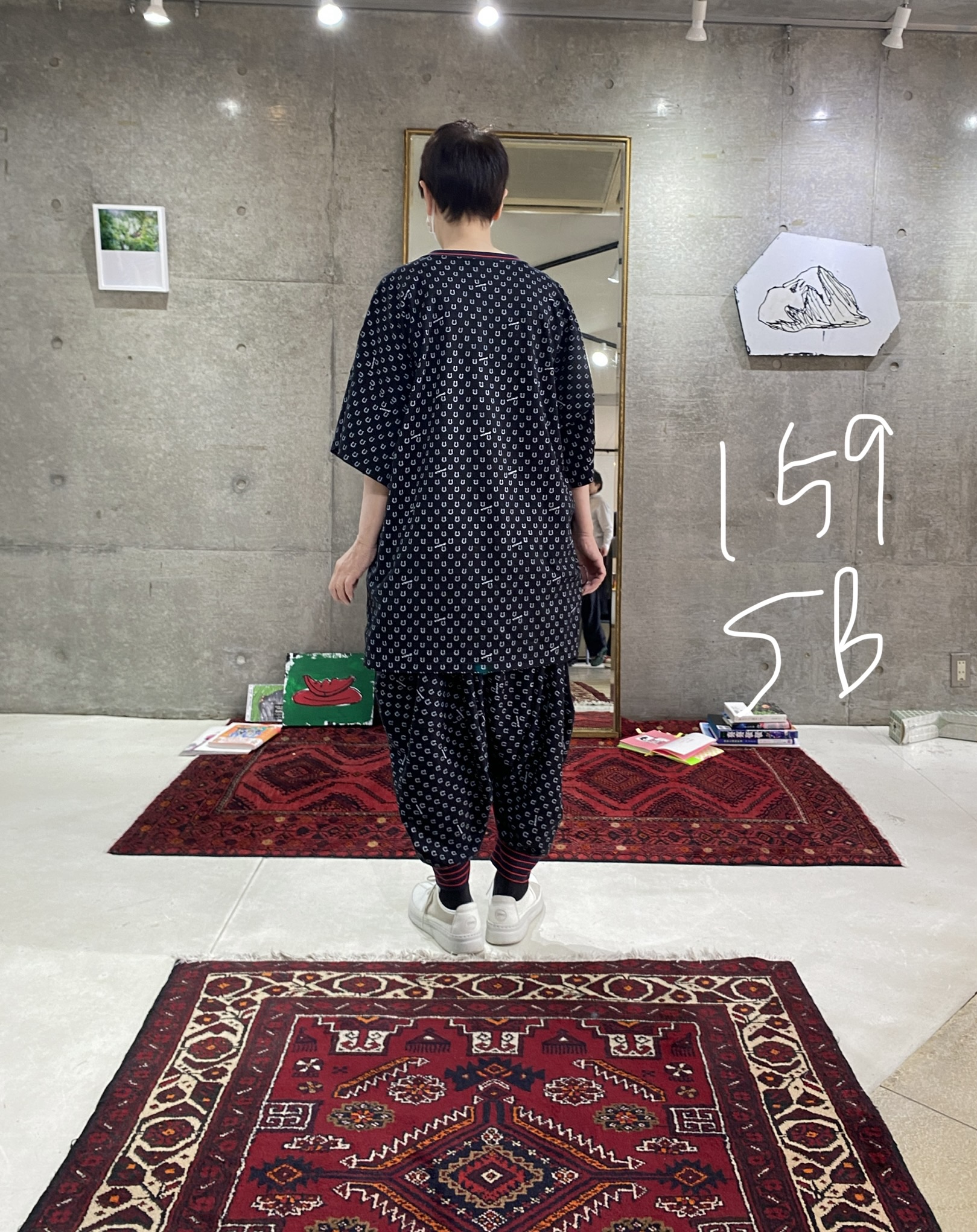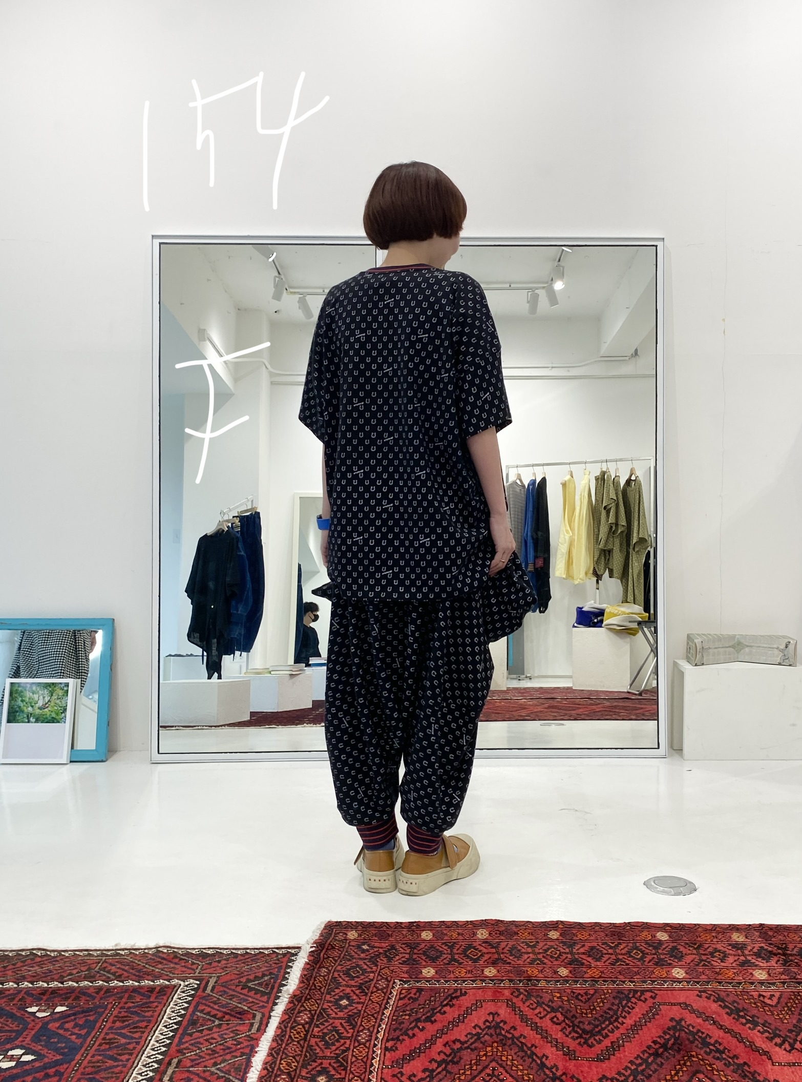 This T-shirt is made from cut-and-sew fabric featuring an all-over horseshoe pattern designed like dots, bringing a subtle sense of something special into everyday life. It is available in three sizes, with the same fit as the Motteke!Droboo series. The dot pattern feels fresh, but instead of ordinary dots, we thought it would be fun to create an original dot pattern using horseshoe motifs—so we designed it this way. It also has a subtle Japanese touch, finished with sporty accents through the line rib detailing. This is the Black color. It pairs easily with the same colors as Sage Green, and in addition, red and pink also look great. Black, of course, as well as white, denim, grey, lemon yellow, and orange all work beautifully. Even with other patterns, it goes especially well with black-and-white gingham. We also highly recommend pairing it with the matching Honeycomb Sarouel Pants in the same fabric for a set-up look. Made from 100% cotton, it is easy to care for. It was designed so you can enjoy summer in a relaxed yet stylish way. Limited pre-order Delivery around mid-July 【Size】01 Front length: 60 cm Back length: 63 cm Width: 116 cm Hem circumference: 120 cm Sleeve length (from center back): 43 cm Cuff width: 44 cm Neck width: 14 cm Slit length: 9 cm F Front length: 70 cm Back length: 73 cm Width: 126 cm Hem circumference: 128 cm Sleeve length (from center back): 45 cm Cuff width: 52 cm Neck width: 15 cm Slit length: 9.5 cm SB Front length: 80 cm Back length: 83 cm Width: 148 cm Hem circumference: 150 cm Sleeve length (from center back): 51 cm Cuff width: 62 cm Neck width: 15 cm Slit length: 12 cm 【Material】100% Organic Cotton [Rib] Cotton 78% / Rayon 18% / Polyurethane 4% 【Color】Black