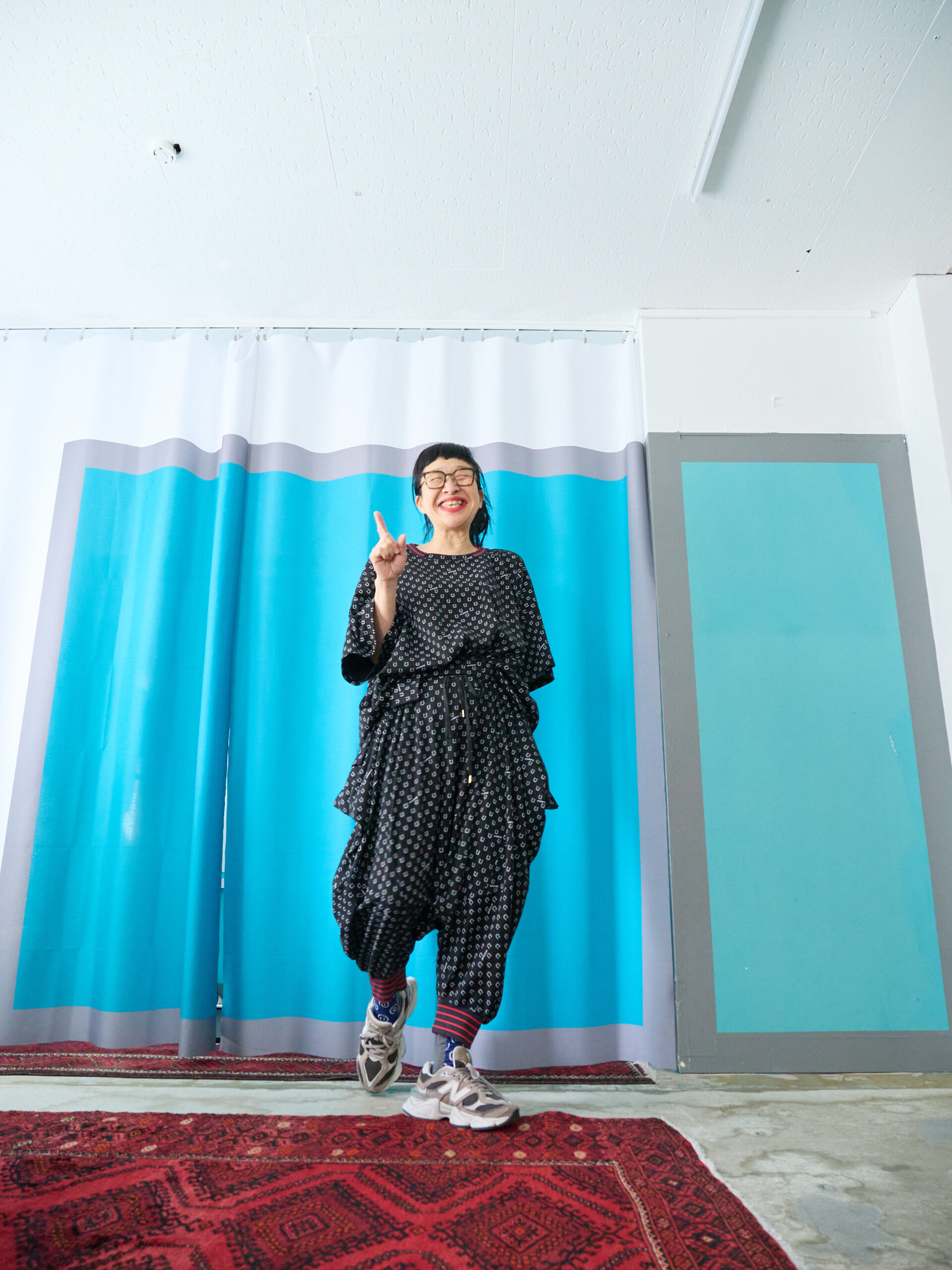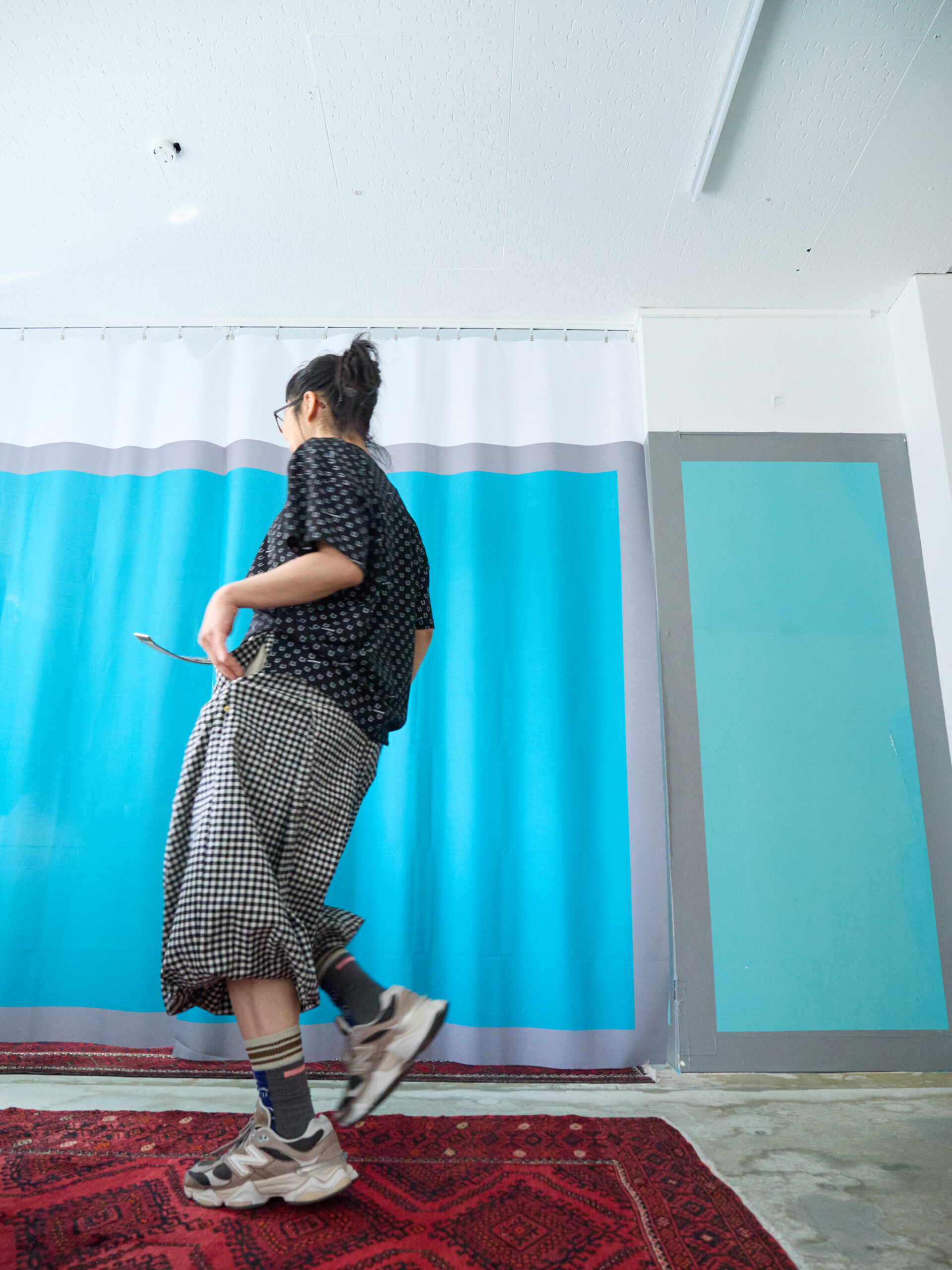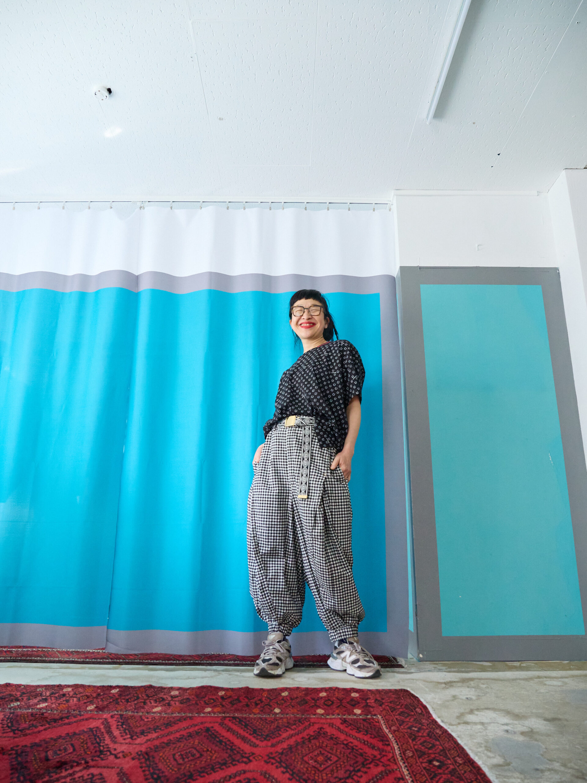 こちらはブラック。合わせやすいカラーは、セージグリーンと同じですが、それに加え、レッドやピンクも素敵です。ブラックはもちろん、白やデニム、グレー、レモンイエロー、オレンジ。そして柄同士ですが、白黒のギンガムチェックとも相性抜群です。