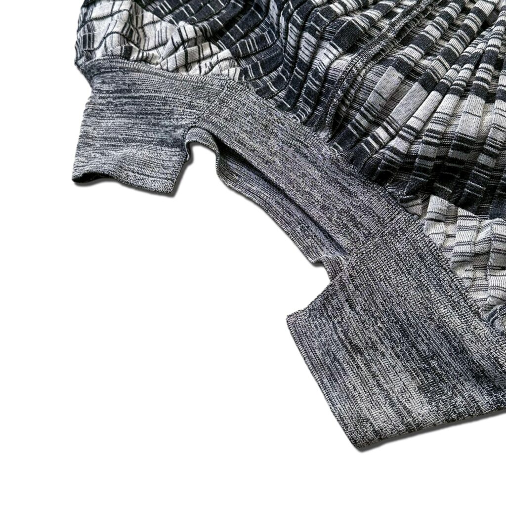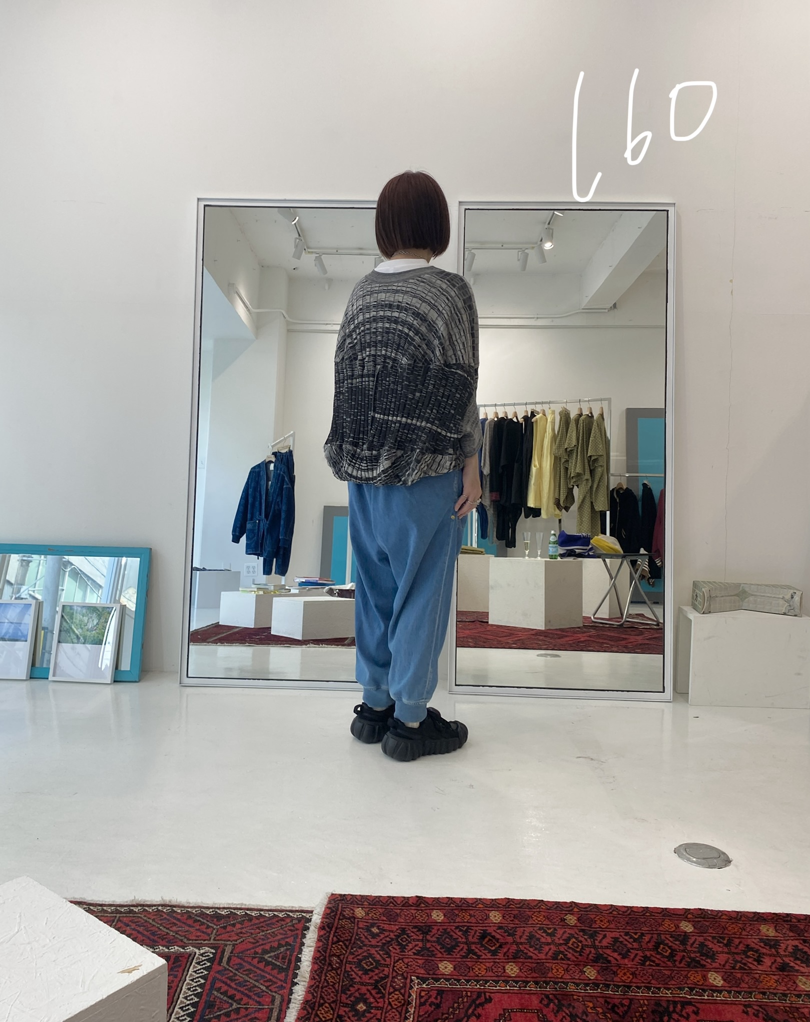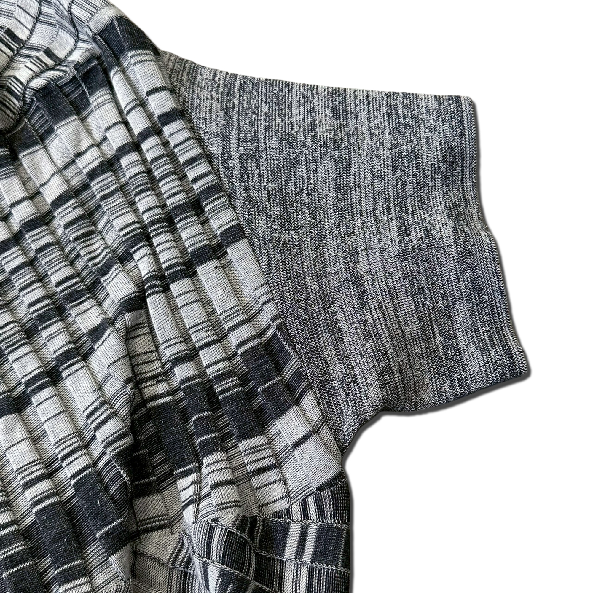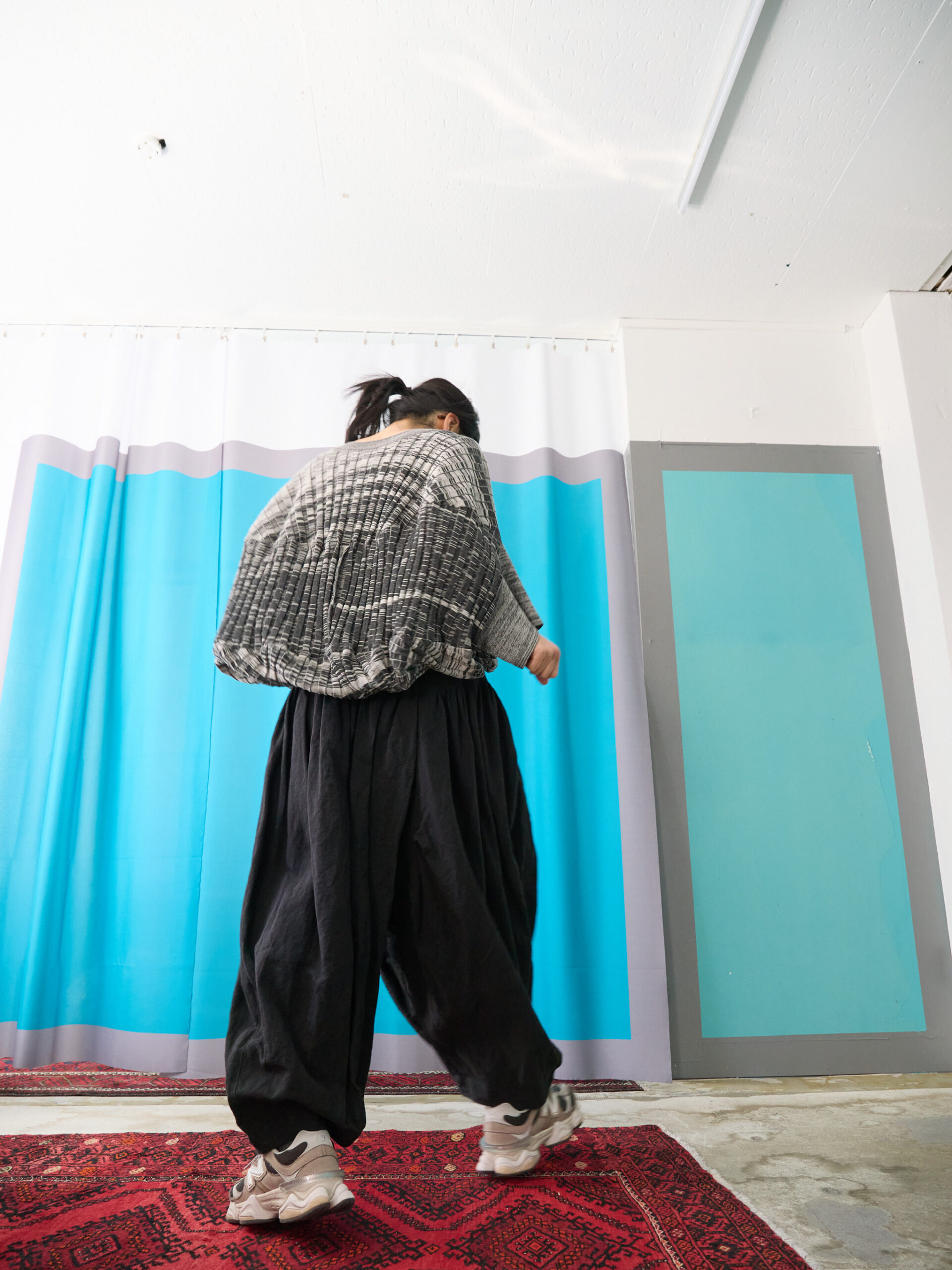 これまでカットソーで展開していたこのシルエットを、今回はニットで表現しました。縦にしっかりとした太めのリブで編み立てることで、身体のラインを拾いすぎず、ほどよい立体感を生み出しています。
