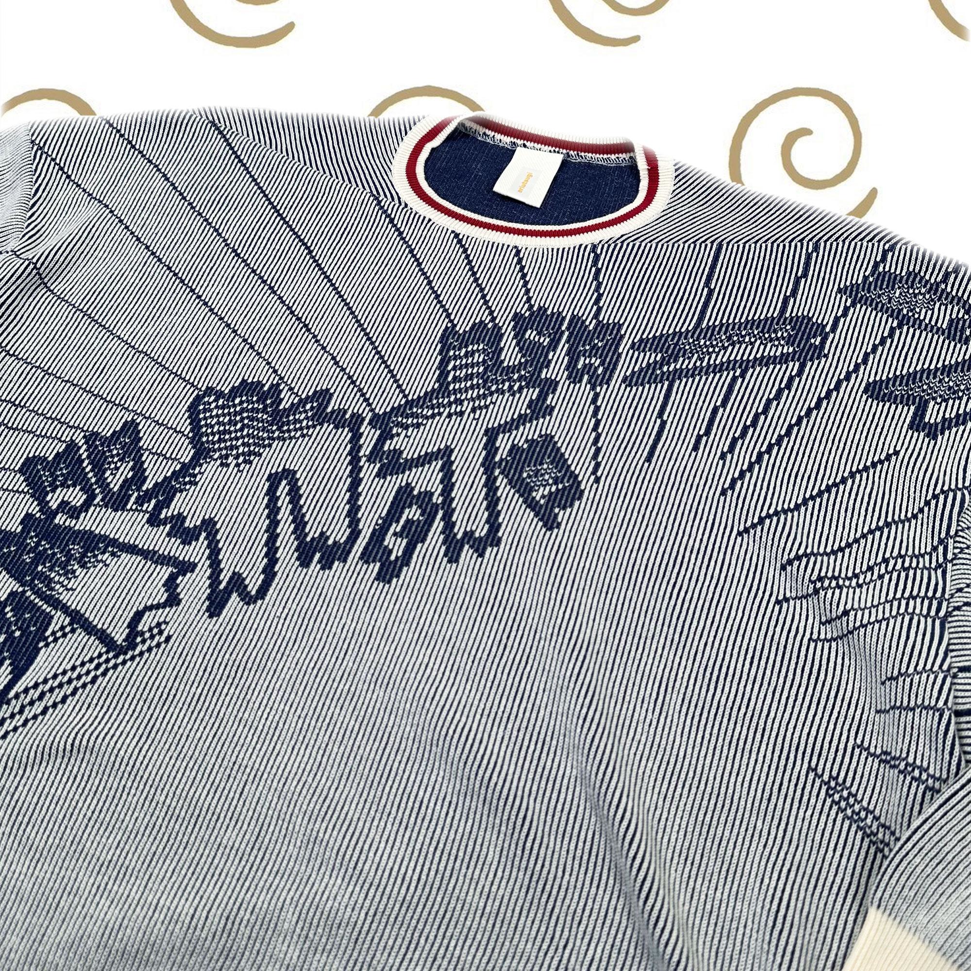 The Bakabone Cotton Knit features a text-based pattern knitted in jacquard. Made from 100% cotton, it is a comfortable year-round piece. The design incorporates the lettering from the scene where Papa shouts “Bakabone,” translating the words into a graphic knit motif. As an accent, red contrast lines are added at the neckline, cuffs, and hem. On the off-white base, the pattern is rendered in navy, creating a playful, casual look full of comic-book charm. Exceptionally soft to the touch, this knit also offers a clean, flattering silhouette when worn. Size: F size. Measurements: front length 72cm, back length 76cm, body width 150cm, hem circumference 95cm, sleeve length (from center back) 89cm, cuff width 19cm, neckline width 13cm. Material: 100% cotton. Color: off-white. Limited-time sale from December 20 (Sat) 8:00 PM to January 1 (Thu) 8:00 PM. Delivery is scheduled for mid-April.