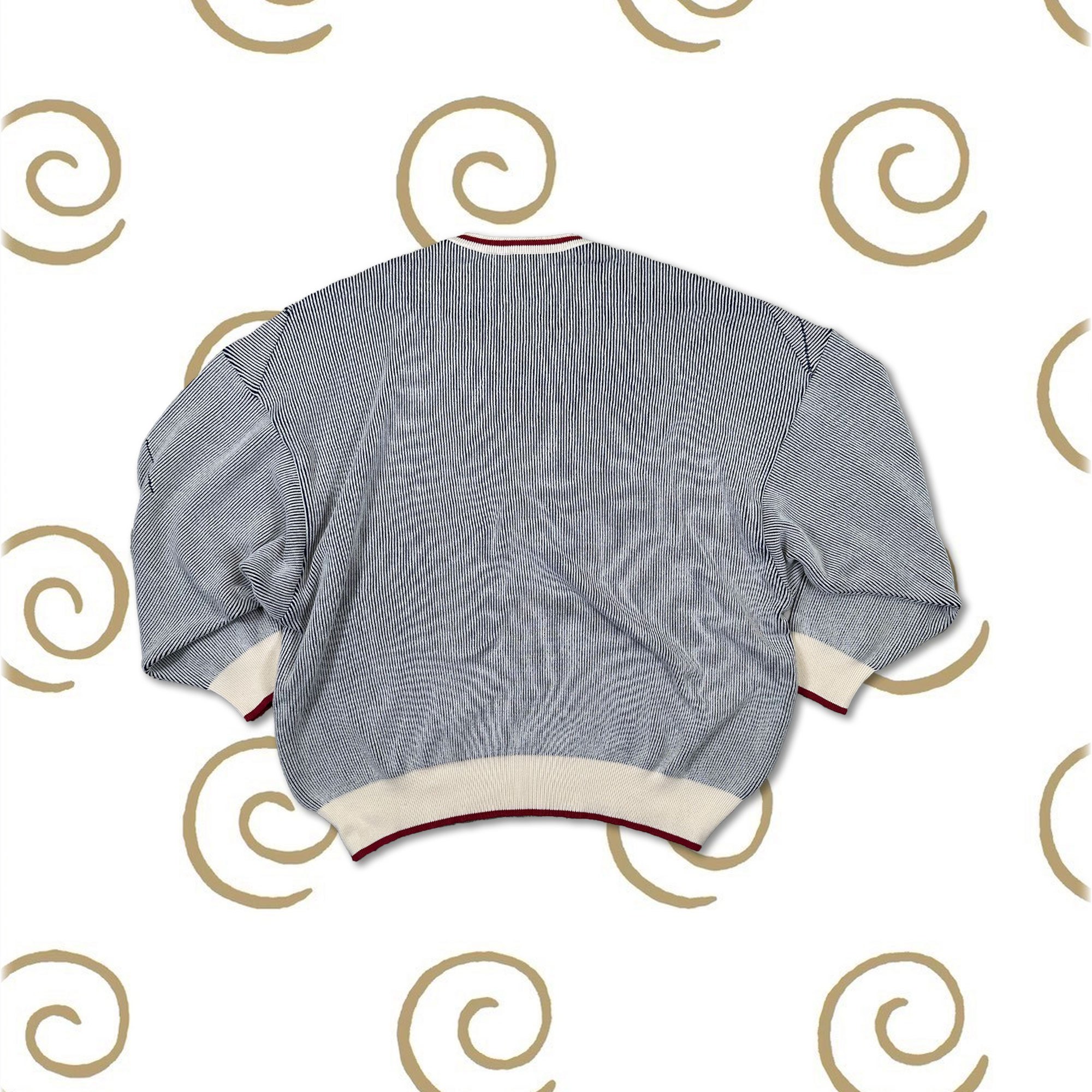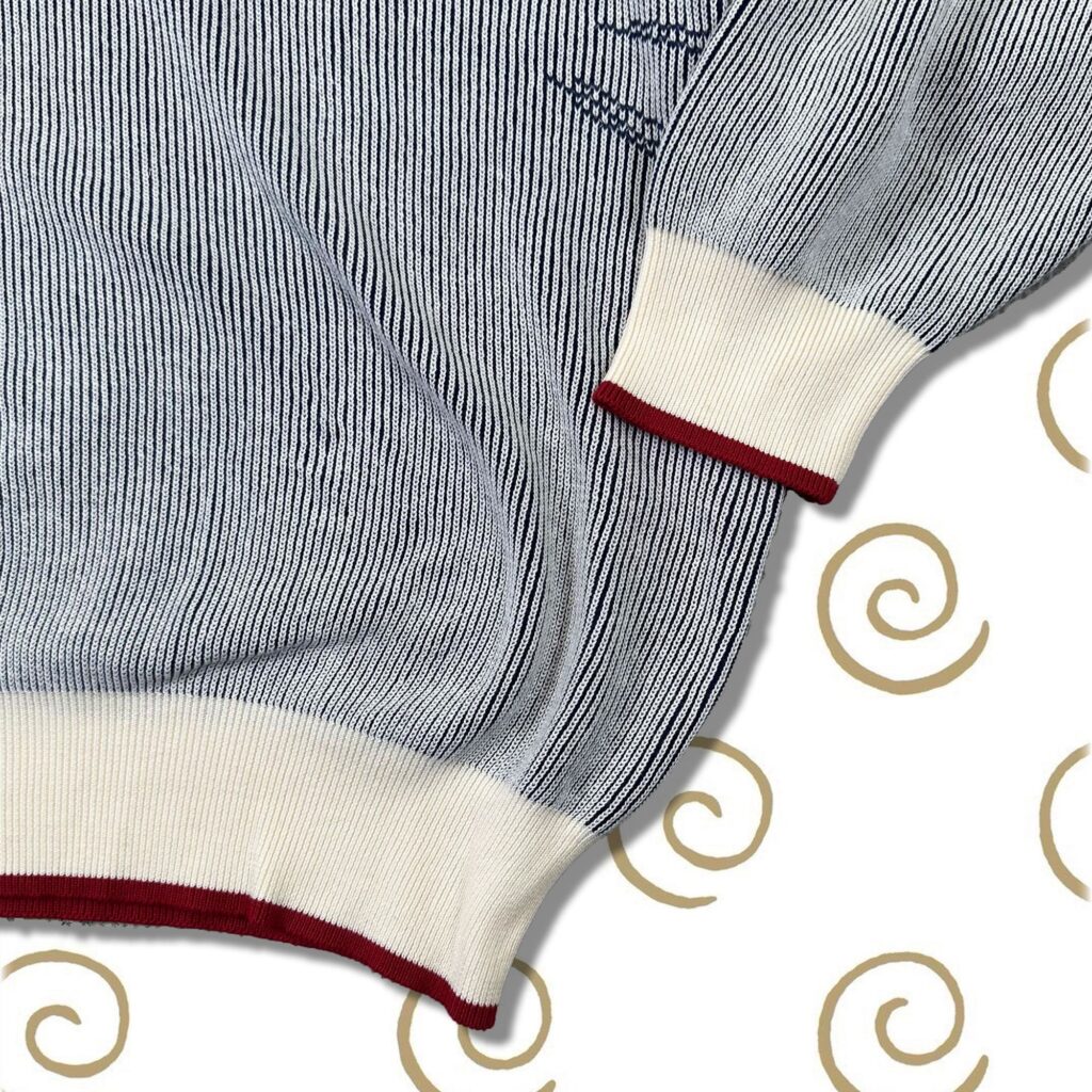 バカボーンコットンニットは、文字柄を、ジャガードで編み込んだニット。コットン100%なので嬉しい通年素材。パパが、「バカボーン」と叫んでいるシーンの文字の絵の柄を編み込みました。アクセントに、襟ぐり、袖と裾口にレッドカラーの配色ライン入り。こちらのオフホワイトの柄は、ネイビーで、楽しくカジュアルに、コミック感満載にしました♡肌触り抜群。着るとすっきり見えるニットです。