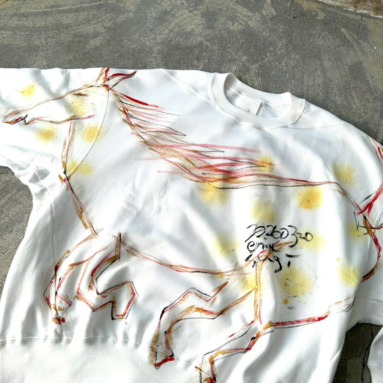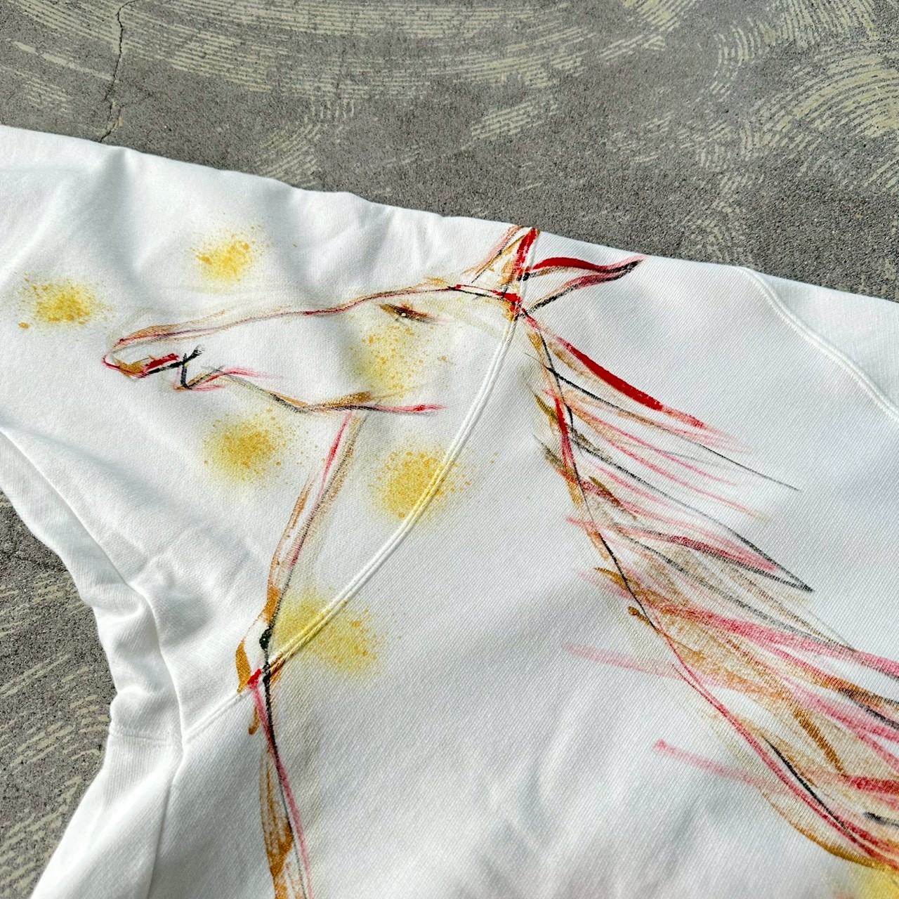 This year, I turn sixty — my Kanreki, the traditional milestone year of the Fire Horse. To mark this moment and with deep gratitude for everything that has brought me here, I painted this piece by hand as a small celebration for myself. A Fire Horse drawn boldly and large, stretching onto the sleeve. A horse that looks as if it is bursting forward, blazing with energy. “I’m sure I can take a big step forward.” Saying that to myself as well, I painted this piece with wishes and prayers. I hope this Fire Horse might gently give a little push to the back of the person who wears it. This special sweatshirt was born to celebrate my sixtieth year. I hope this piece can also become a small celebration of a new step in your life. ♡ Each piece is hand-painted with acrylic paint. The sweatshirt will be washed once before delivery. 【Size】 Front length 69cm Back length 77cm Body width 144cm Hem circumference 86cm Sleeve length (center back) 84cm Cuff width 19cm Neck width 15cm 【Material】 100% Cotton 【Color】 Big Fire Horse Birthday Sweat