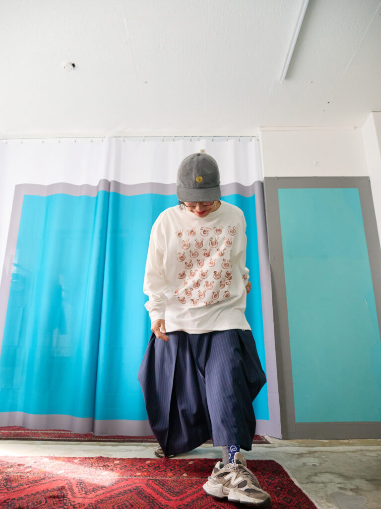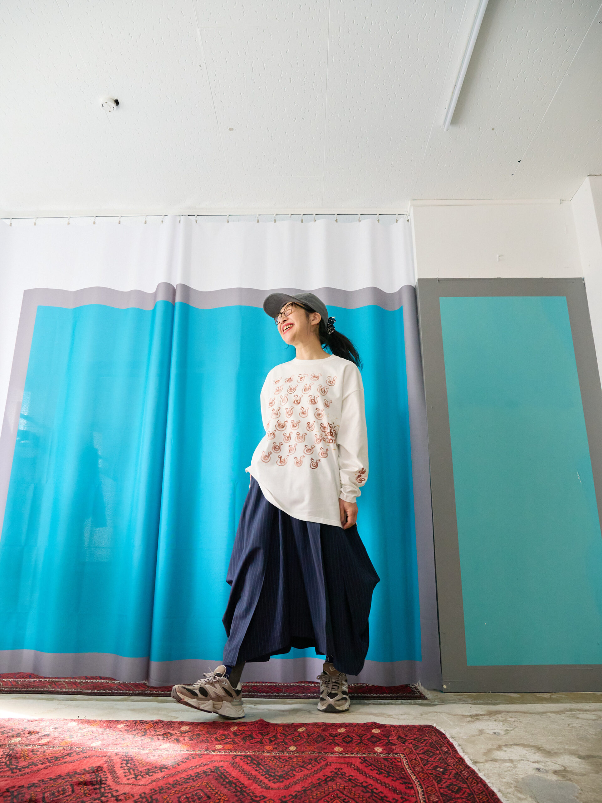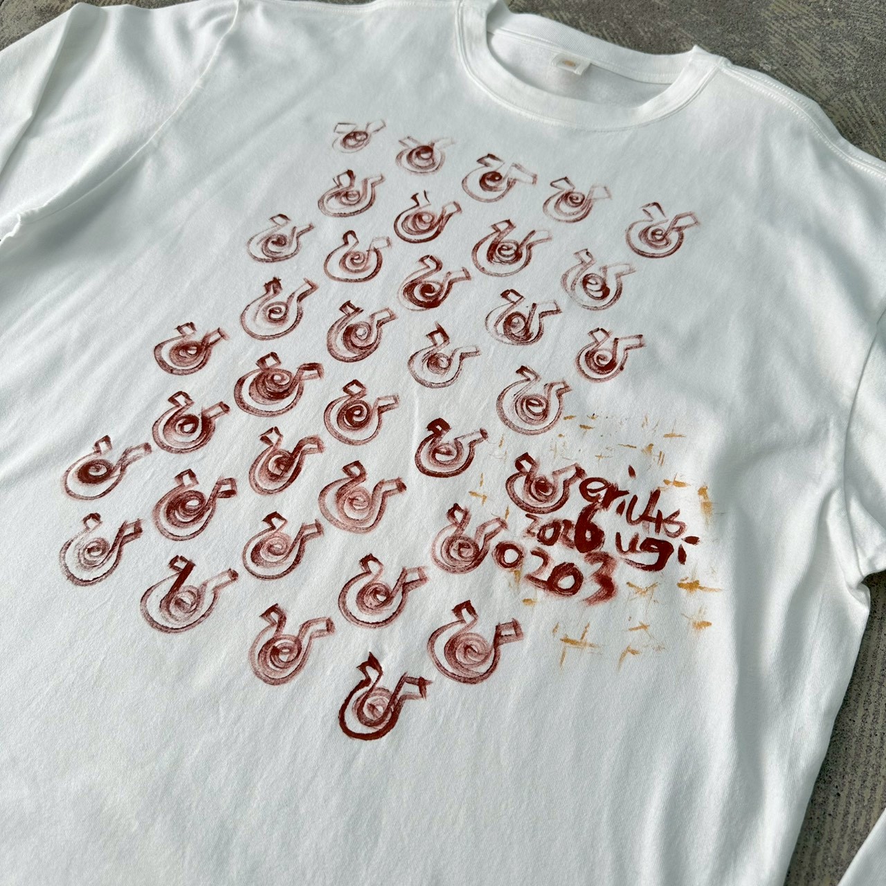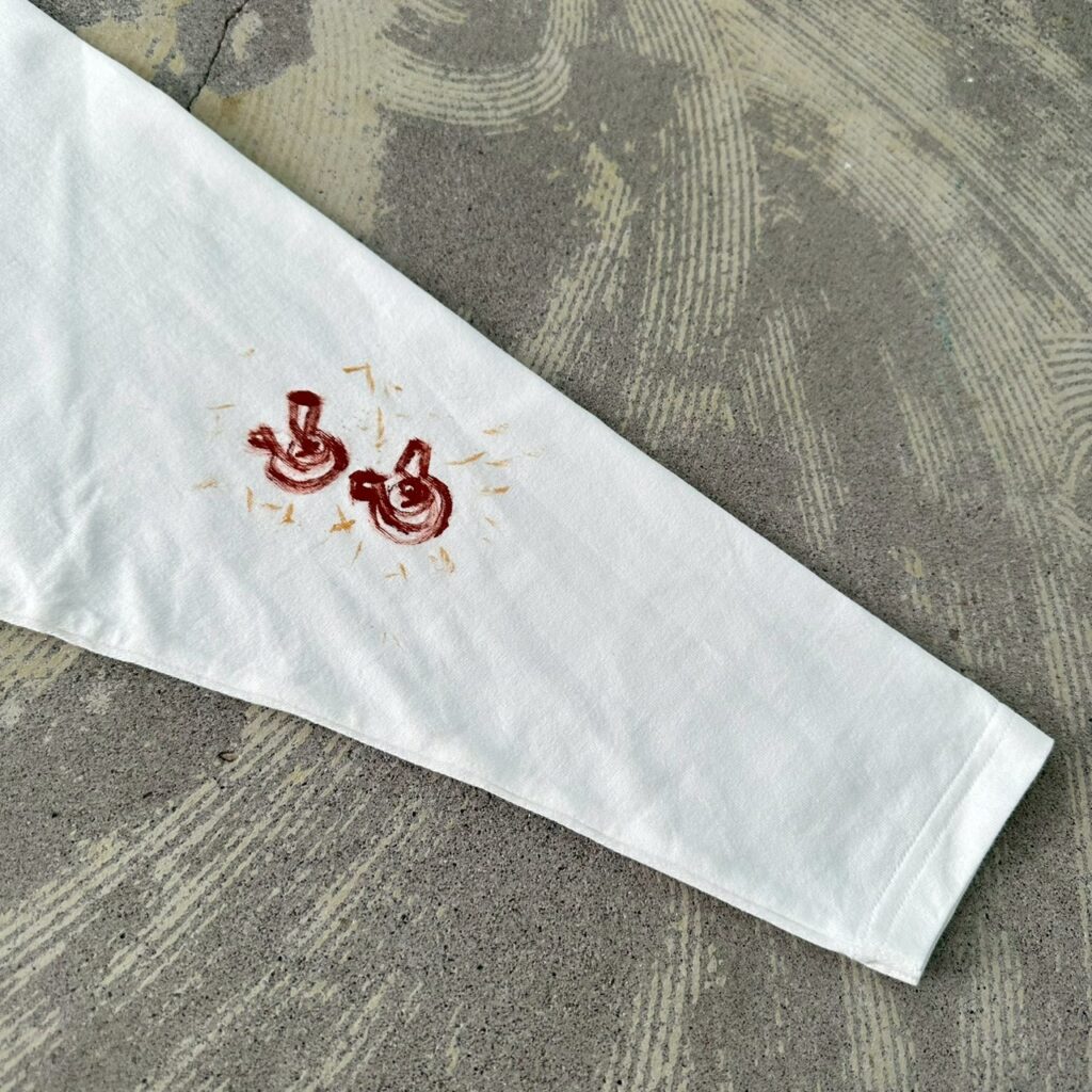 A hand-painted piece depicting recent moments. “Horseshoe-kun,” a talisman-like motif with an e-spiral inside the horseshoe, was born this year, the Year of the Horse. As I was painting, it somehow felt like an old Space Invaders game, bringing back a sense of nostalgia. It’s sure to help you run smoothly through this year ♡ Painted on Setsubun day, full of energy! This F size is recommended for men of a standard size, or for those who want to wear it casually in an oversized fit. A commemorative hand-painted long-sleeve T-shirt with the date it was painted. May this special piece become a keepsake for you as well ♡ Painted with acrylic paints. The garment is delivered after being washed once. Size Front length 70cm Back length 73cm Body width 126cm Hem circumference 117cm Shoulder width 57cm Sleeve length 87cm Cuff width 22cm Neck width 17cm Slit length 9.5cm Material 100% organic cotton Color e Horseshoe Parade