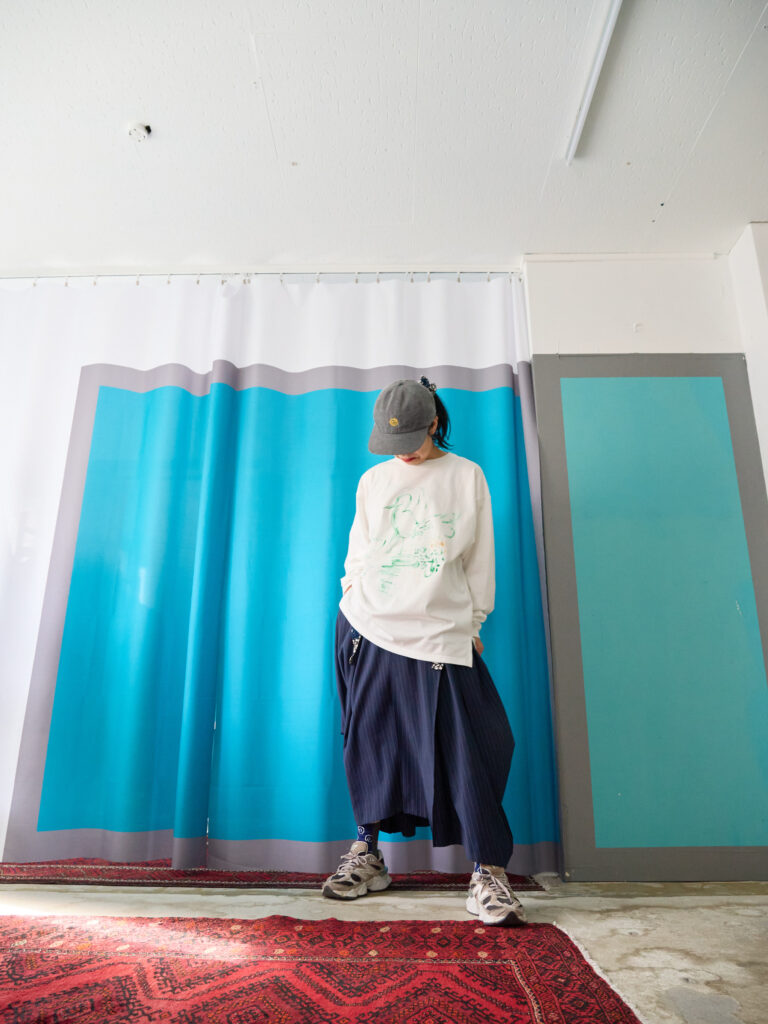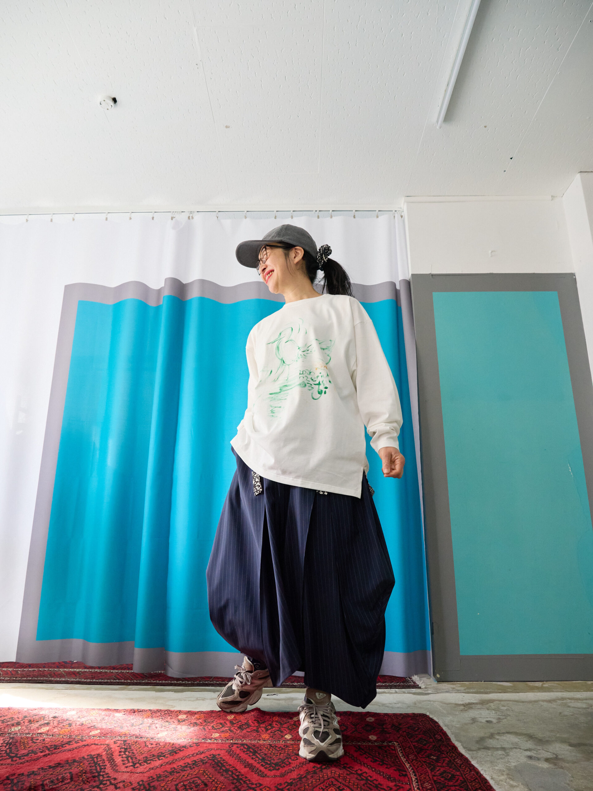This hand-painted piece reflects my recent moments. On Setsubun day, when I went to visit Jindaiji Temple, I met a little egret for the first time in a small pond. The egret was trembling and looked very cold. Later, I learned that it wasn’t because of the cold, but a movement it makes while catching food. Still, the sight left a strong impression on me, and I couldn’t help wanting to paint it, so I did after I returned home. Drawing something that is both cute and beautiful is difficult, and honestly, it was very challenging. When I thought of a little egret, I imagined wanting to wear one painted in green on a white base, and that idea led to this color combination. The F size is recommended for those with a standard men’s size or for anyone who wants to wear it casually in a relaxed, oversized fit. This is a commemorative hand-painted long-sleeve T-shirt dated with Setsubun. I hope this special piece becomes a keepsake for you as well. Painted with acrylic paint and delivered after being washed once. Size: Front length 70cm, Back length 73cm, Body width 126cm, Hem circumference 117cm, Shoulder width 57cm, Sleeve length from center back 87cm, Cuff width 22cm, Neck width 17cm, Slit length 9.5cm. Material: 100% organic cotton. Color: Cold, Little Egret?.