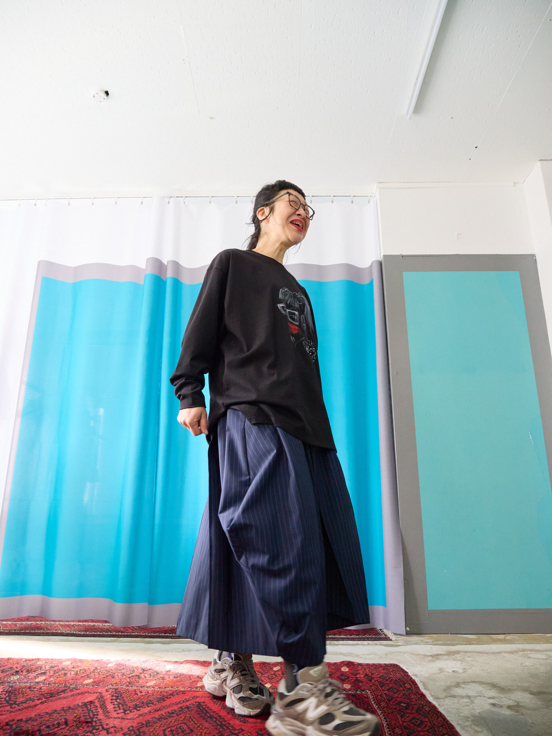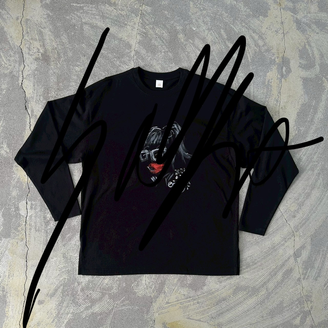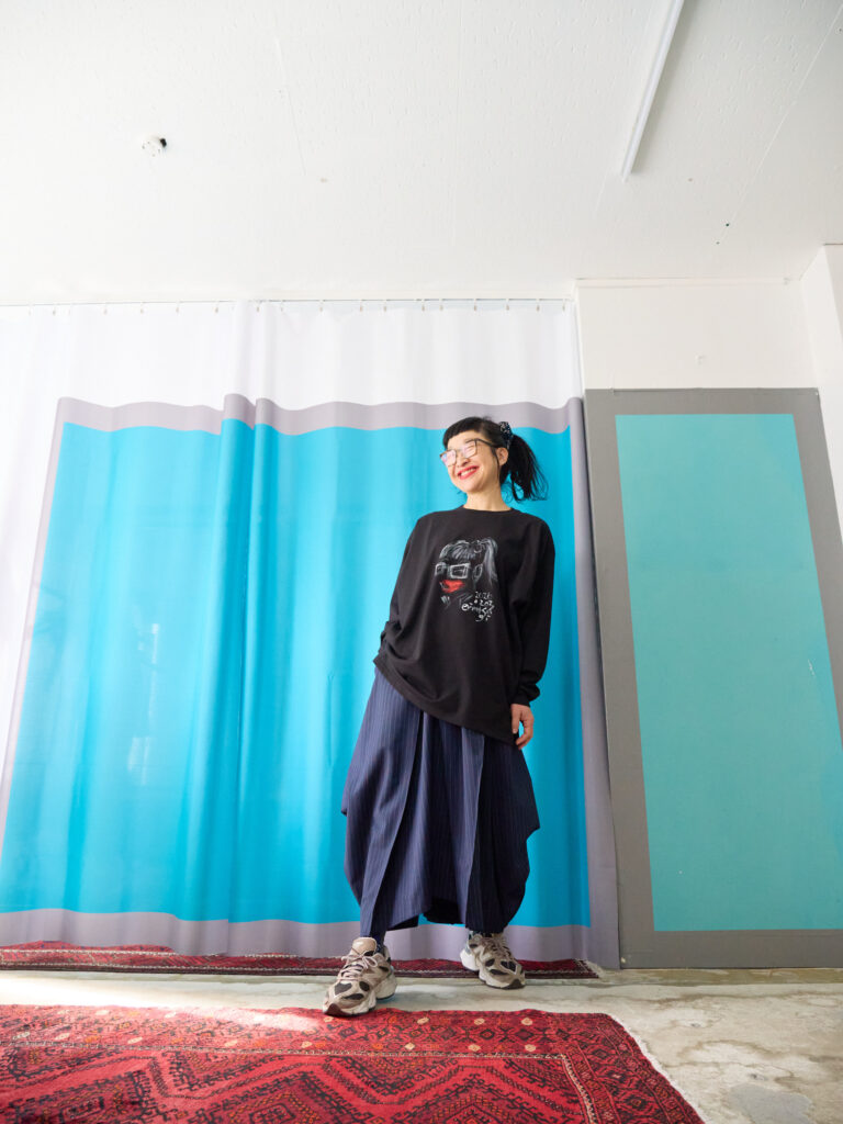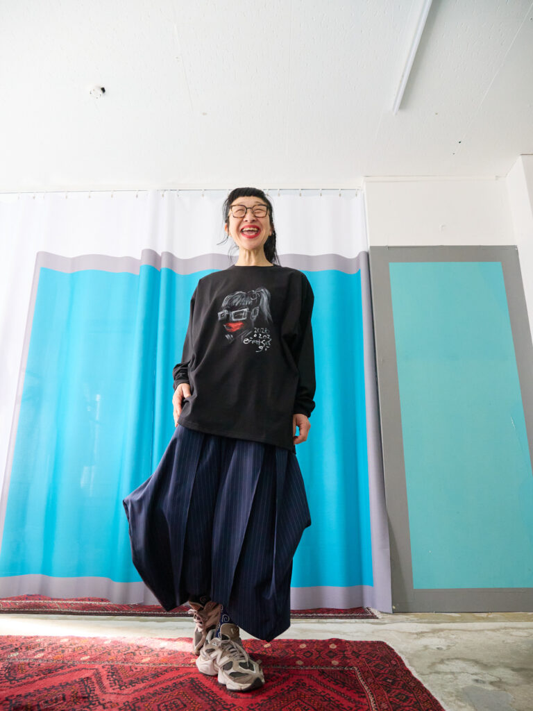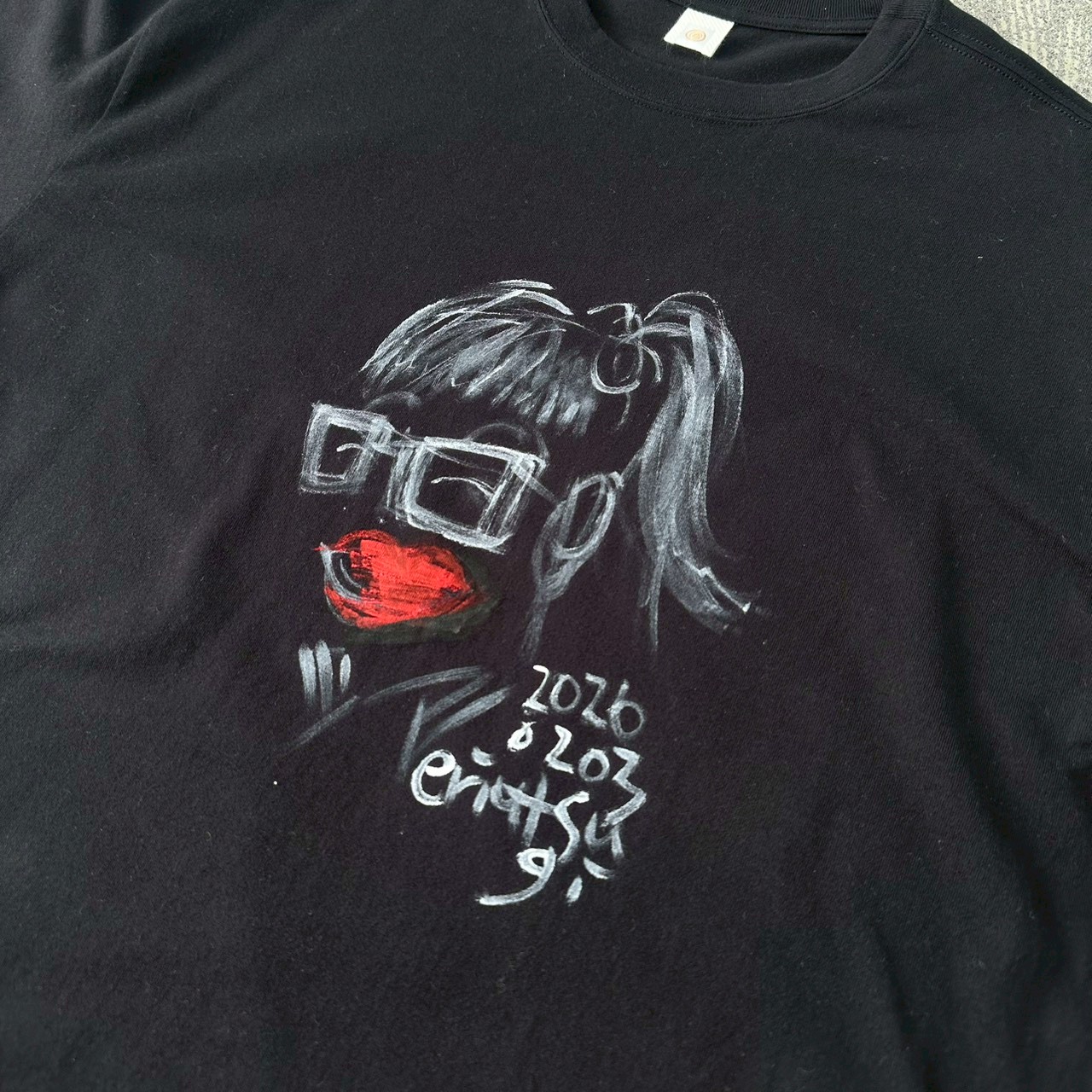 A hand-painted piece depicting recent moments. This is a self-portrait of Utsugi, who, inspired by the Year of the Horse, boldly started wearing her hair in a ponytail. She also changed her glasses, giving a slightly different impression. It will surely work as a charm to ward off bad luck (laugh). Keep it as a talisman ♡ Painted on Setsubun with a wish to run through this year smoothly and with strength. The F size is recommended for those with a standard men’s fit or for anyone who wants to wear it casually in a relaxed, oversized style. A commemorative hand-painted long-sleeve T-shirt with the date included. May this special piece become a keepsake for you as well ♡ Painted with acrylic paints. Each piece is delivered after being washed once. Size: front length 70cm, back length 73cm, body width 126cm, hem circumference 117cm, shoulder width 57cm, sleeve length 87cm, cuff width 22cm, neck width 17cm, slit length 9.5cm. Material: 100% organic cotton. Color: Talisman.