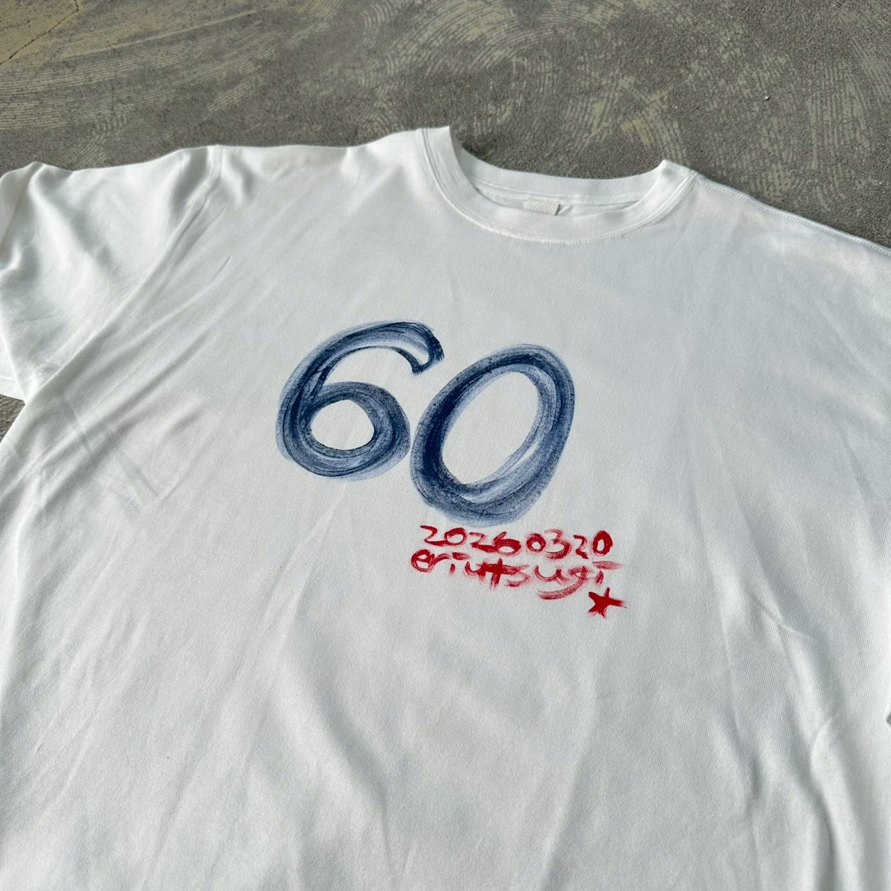This year, I turn sixty — my Kanreki, the traditional milestone year of the Fire Horse. To mark this moment and with deep gratitude for everything that has brought me here, I painted this piece by hand as a small celebration for myself. When I turned forty, I made a “40T.” This time, I painted a parody of it. A little funny, right? This time it’s “60T.” I would be so happy if anyone remembers it or even still has one. Twenty years have passed since then. Twenty years filled with gratitude. This special long-sleeve T-shirt was created to celebrate my sixtieth year. I hope this piece can also become a small celebration of a new step in your life. *Hand-painted with acrylic paint. 【Size】 F Length 72cm Body width 122cm Hem circumference 114cm Shoulder width 57cm Sleeve length (center back) 87cm Cuff width 20cm Neck width 16.5cm Slit length 9cm 【Material】 100% Organic Cotton 【Color】 Off White