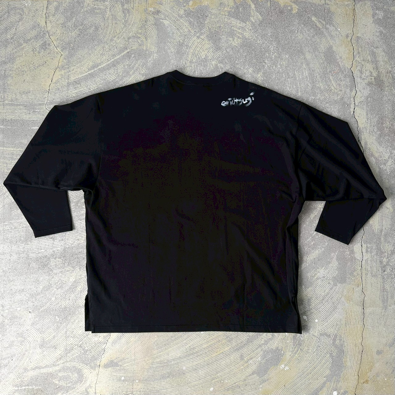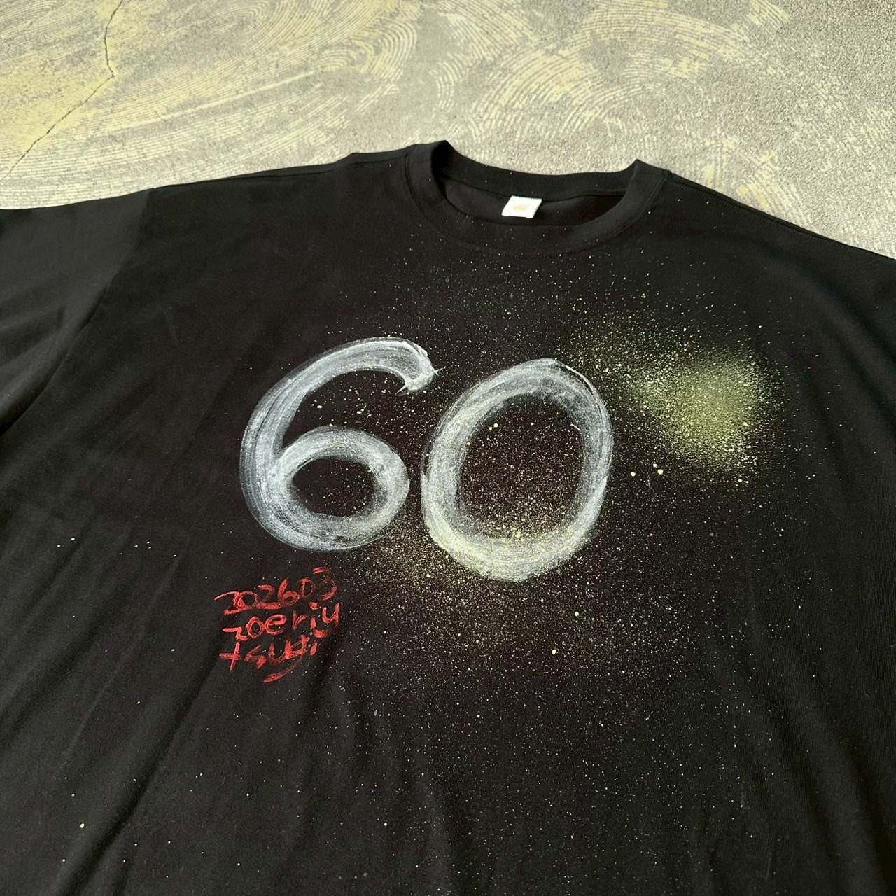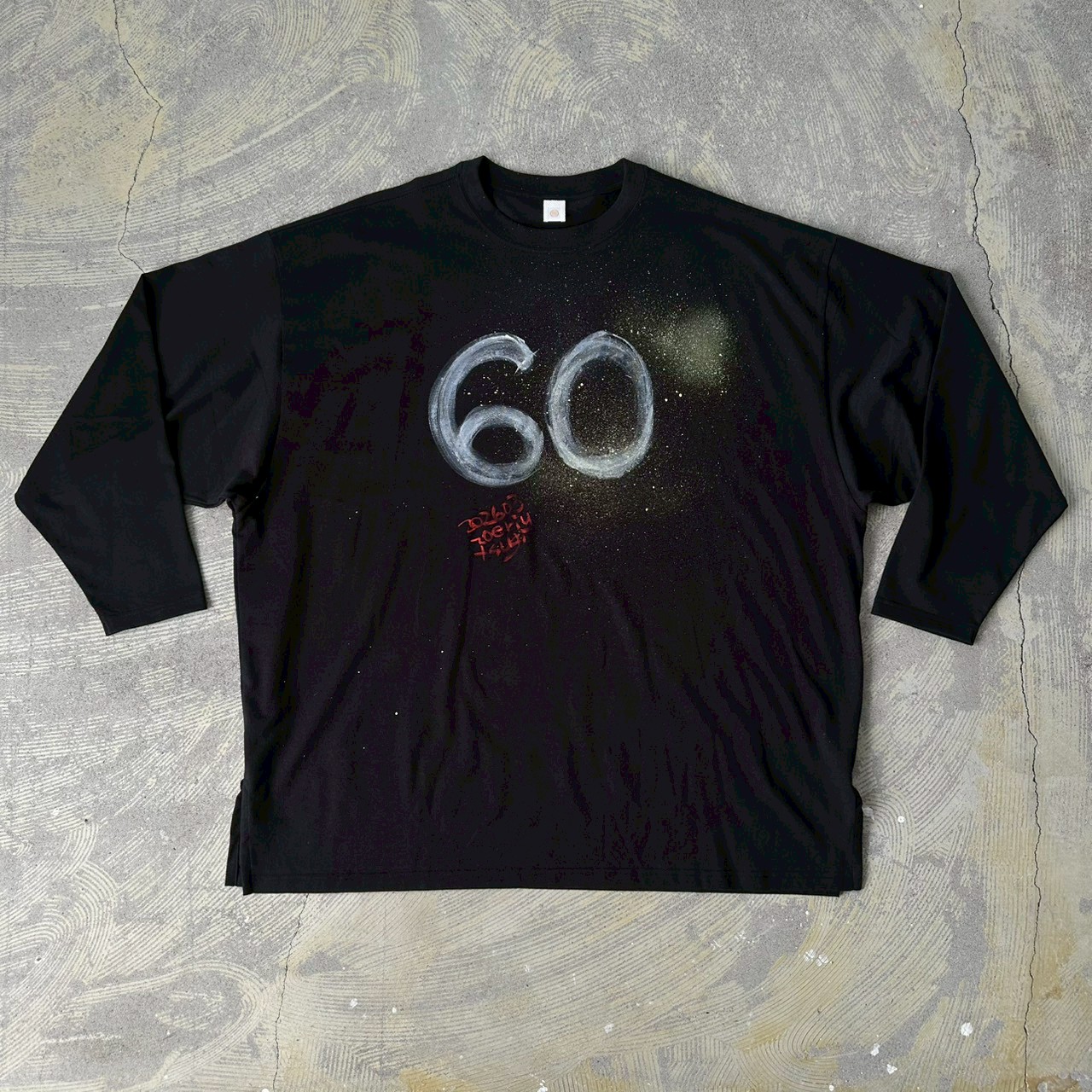 This year, I turn sixty — my Kanreki, the traditional milestone year of the Fire Horse. To mark this moment and with deep gratitude for everything that has brought me here, I painted this piece by hand as a small celebration for myself. When I turned forty, I made a “40T.” This time, I painted a parody of it. A little funny, right? This time it’s “60T.” On a black base, I gave it a quick spray to create a spacey feeling. Sixty years feels mysterious, almost like the universe — somehow vast and full of wonder. This special long-sleeve T-shirt was created to celebrate my sixtieth year. I hope this piece can also become a small celebration of a new step in your life. *Hand-painted with acrylic paint. 【Size】 SB Length 80cm Body width 142cm Hem circumference 132cm Shoulder width 64cm Sleeve length (center back) 87cm Cuff width 22cm Neck width 17cm Slit length 12cm 【Material】 100% Organic Cotton 【Color】 Black