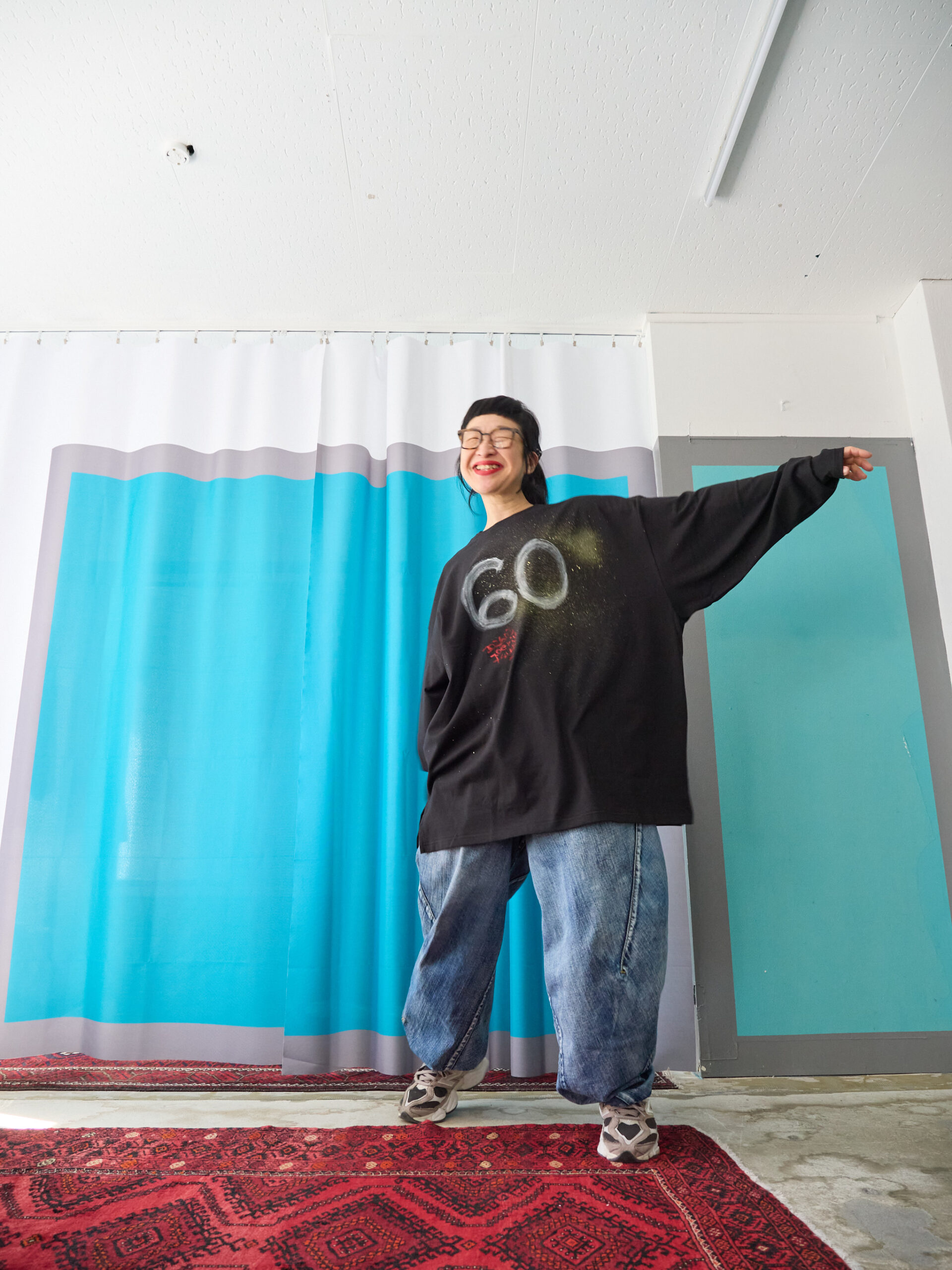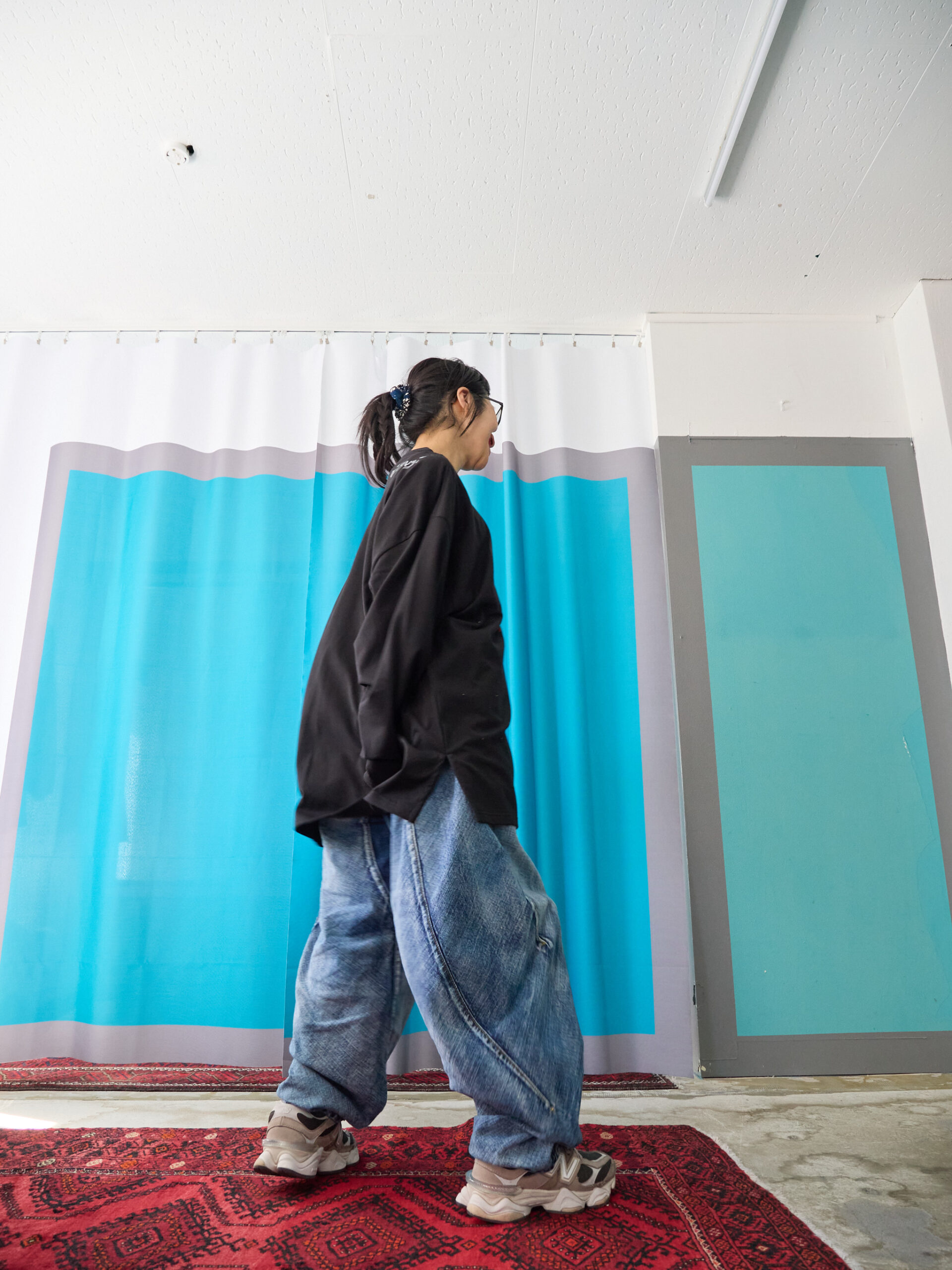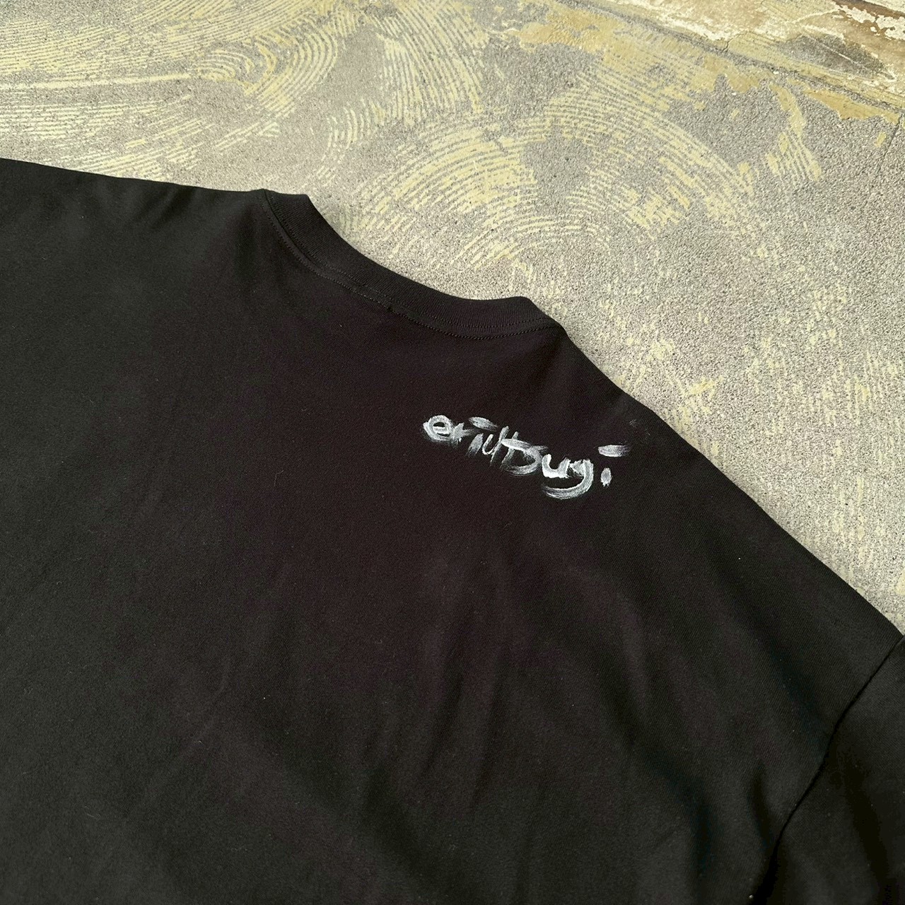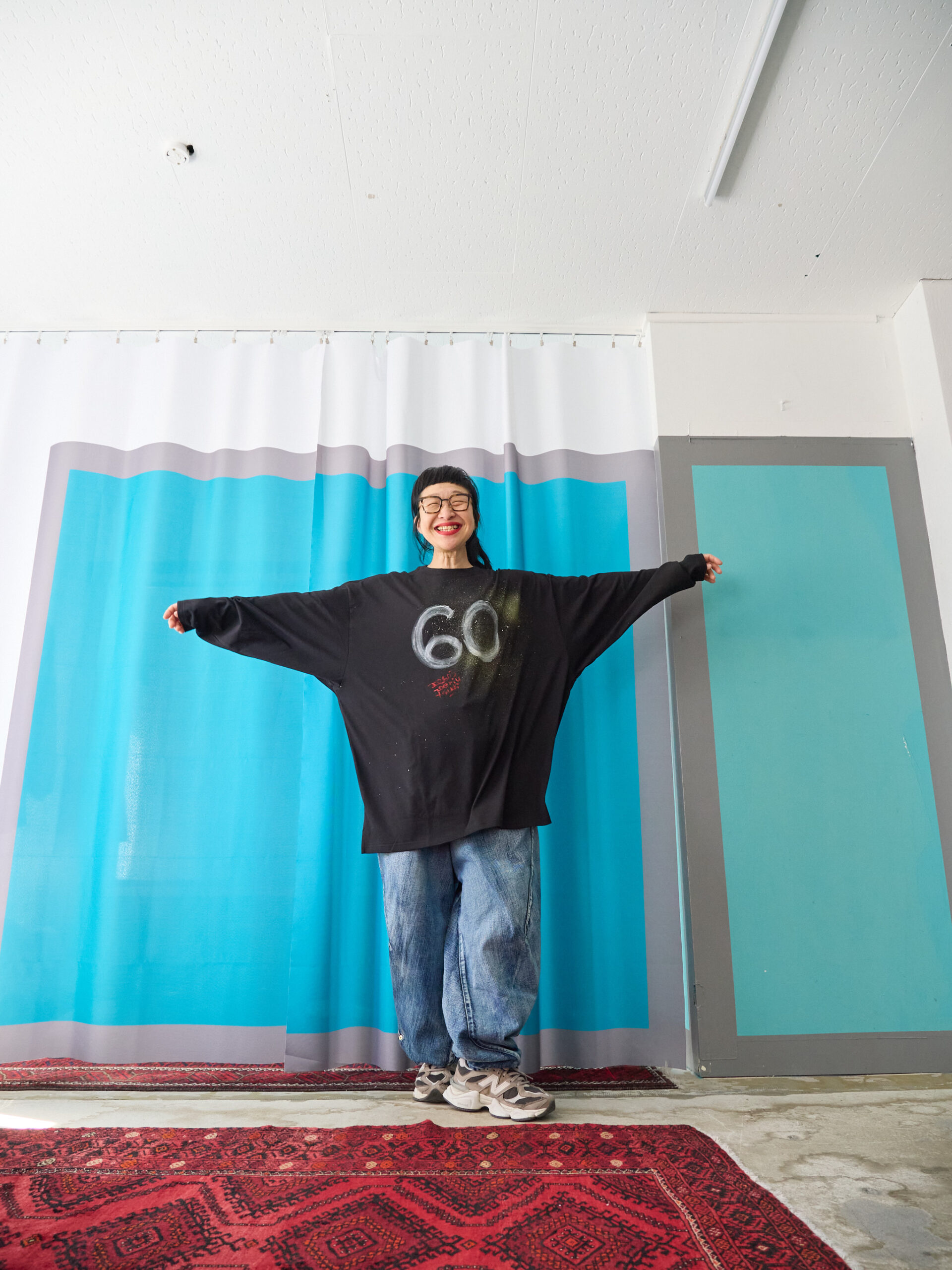 This year, I turn sixty — my Kanreki, the traditional milestone year of the Fire Horse. To mark this moment and with deep gratitude for everything that has brought me here, I painted this piece by hand as a small celebration for myself. When I turned forty, I made a “40T.” This time, I painted a parody of it. A little funny, right? This time it’s “60T.” On a black base, I gave it a quick spray to create a spacey feeling. Sixty years feels mysterious, almost like the universe — somehow vast and full of wonder. This special long-sleeve T-shirt was created to celebrate my sixtieth year. I hope this piece can also become a small celebration of a new step in your life. *Hand-painted with acrylic paint. 【Size】 SB Length 80cm Body width 142cm Hem circumference 132cm Shoulder width 64cm Sleeve length (center back) 87cm Cuff width 22cm Neck width 17cm Slit length 12cm 【Material】 100% Organic Cotton 【Color】 Black